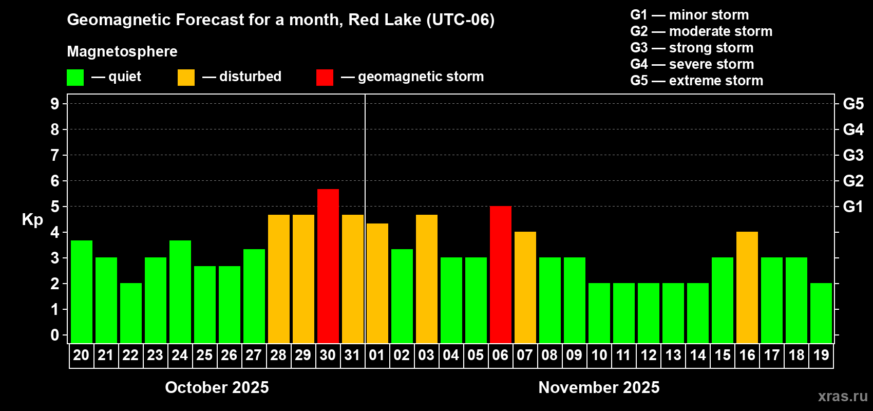 Geomagnetic storm forecast in Red Lake for Oct 20, 2025