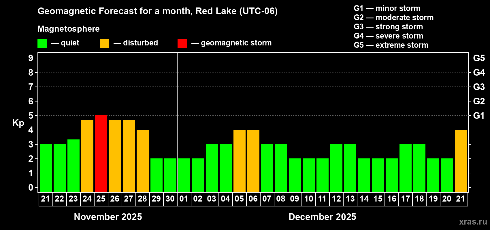 Geomagnetic storm forecast in Red Lake for Nov 21, 2025
