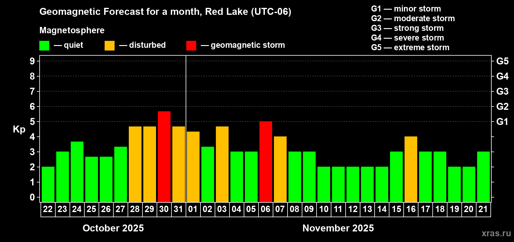 Geomagnetic storm forecast in Red Lake for Oct 22, 2025