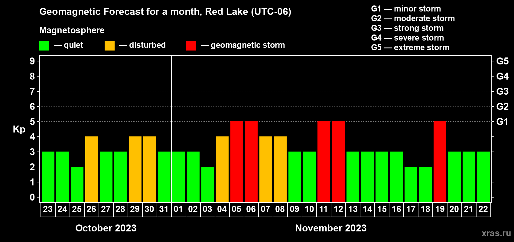 Geomagnetic storm forecast in Red Lake for Oct 23, 2023