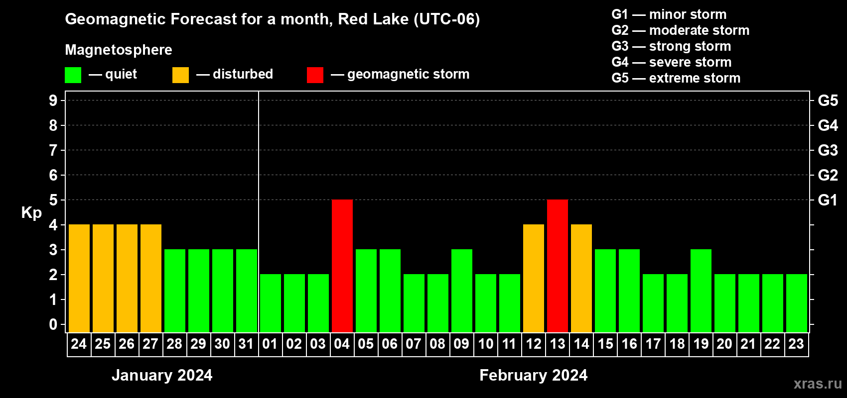 Geomagnetic storm forecast in Red Lake for Jan 24, 2024