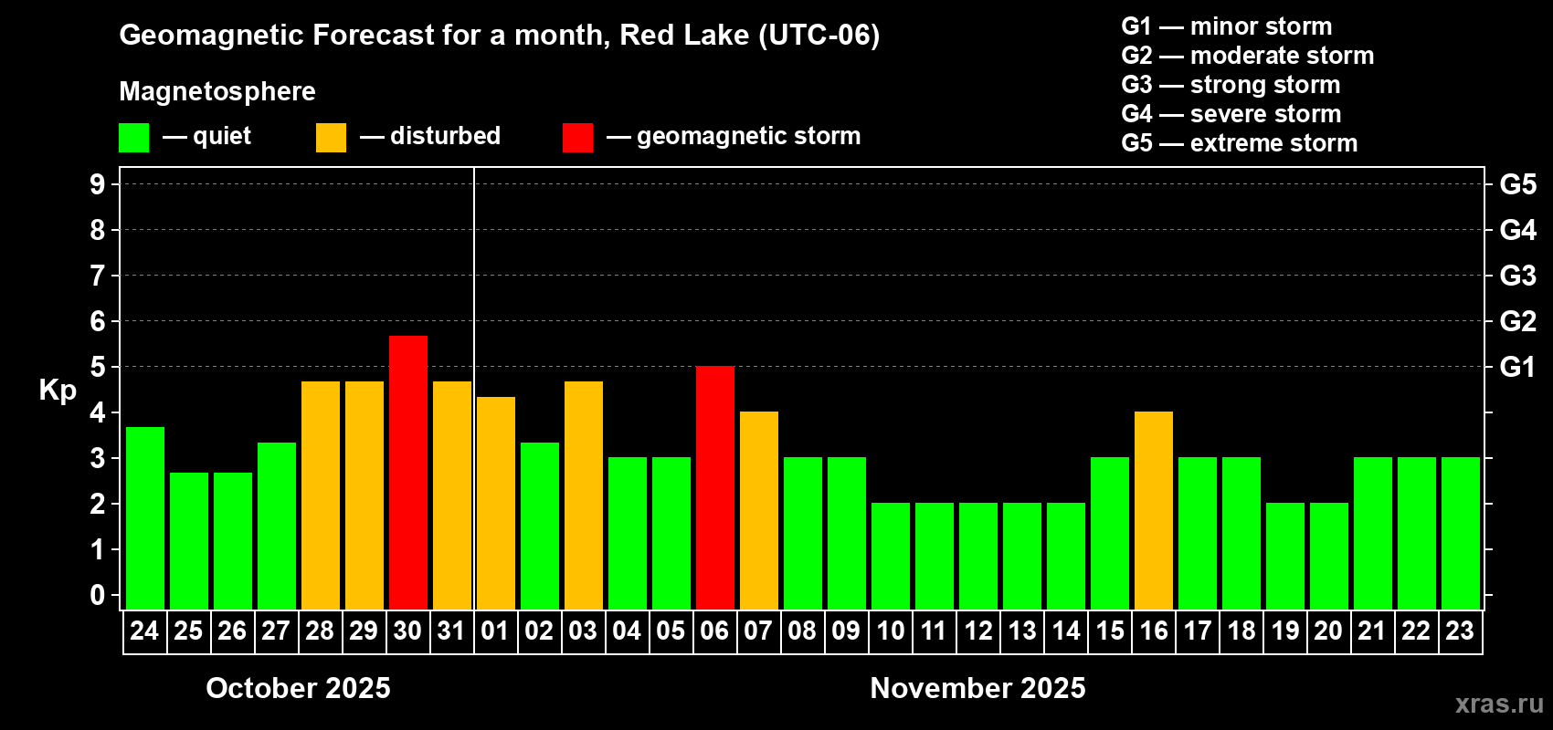 Geomagnetic storm forecast in Red Lake for Oct 24, 2025