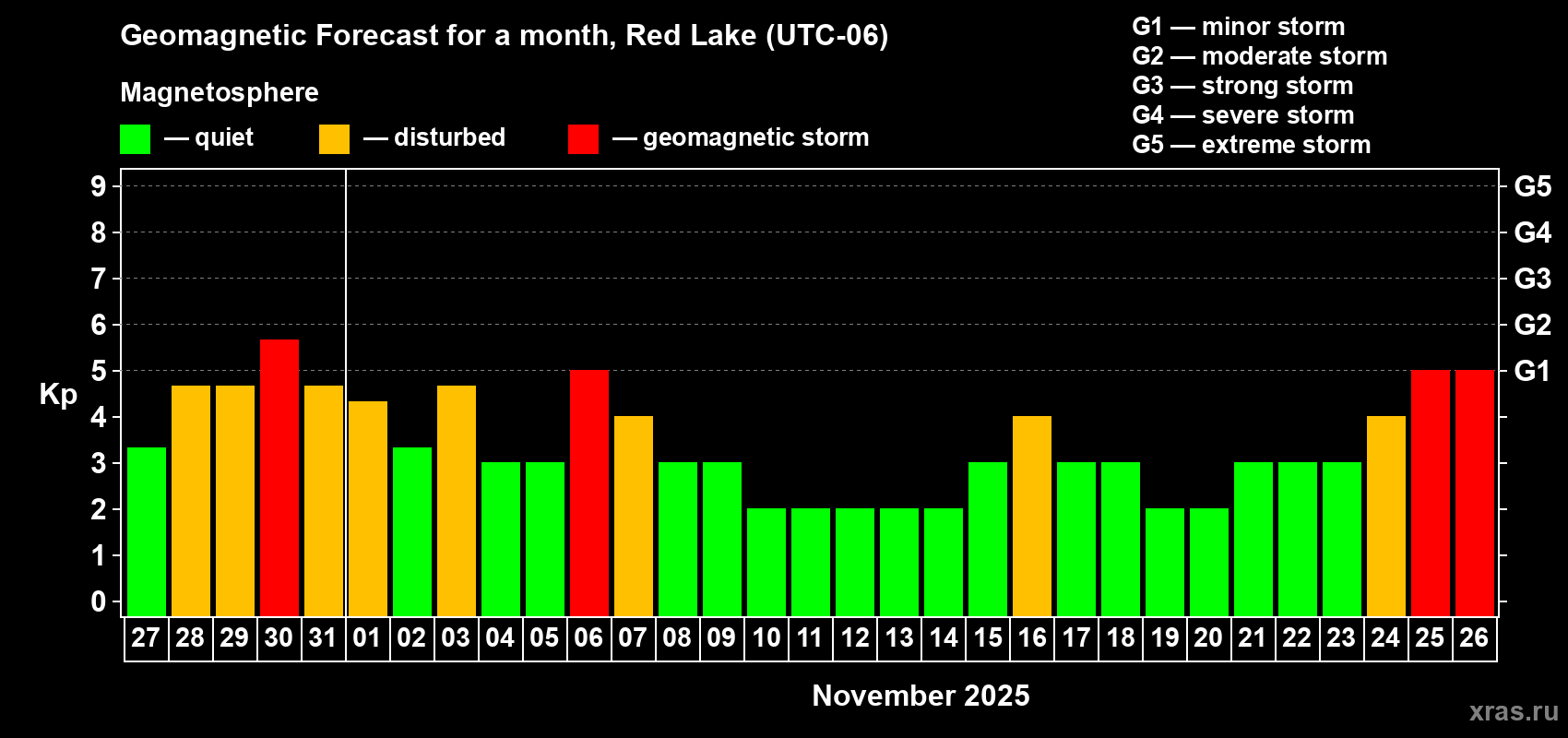 Geomagnetic storm forecast in Red Lake for Oct 27, 2025