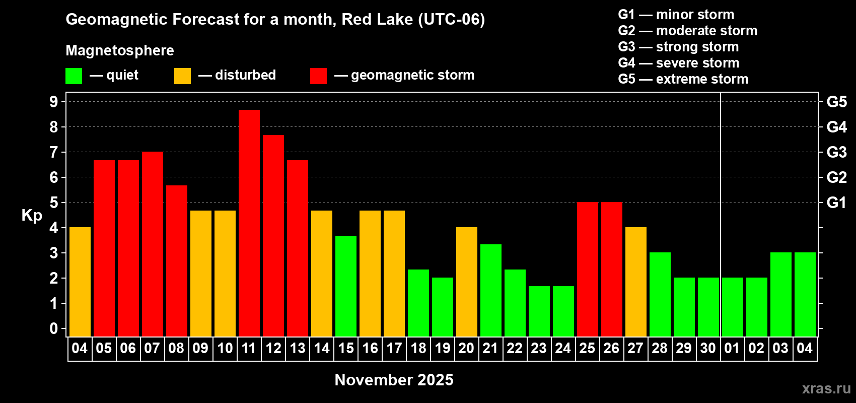 Geomagnetic storm forecast in Red Lake for Nov 04, 2025