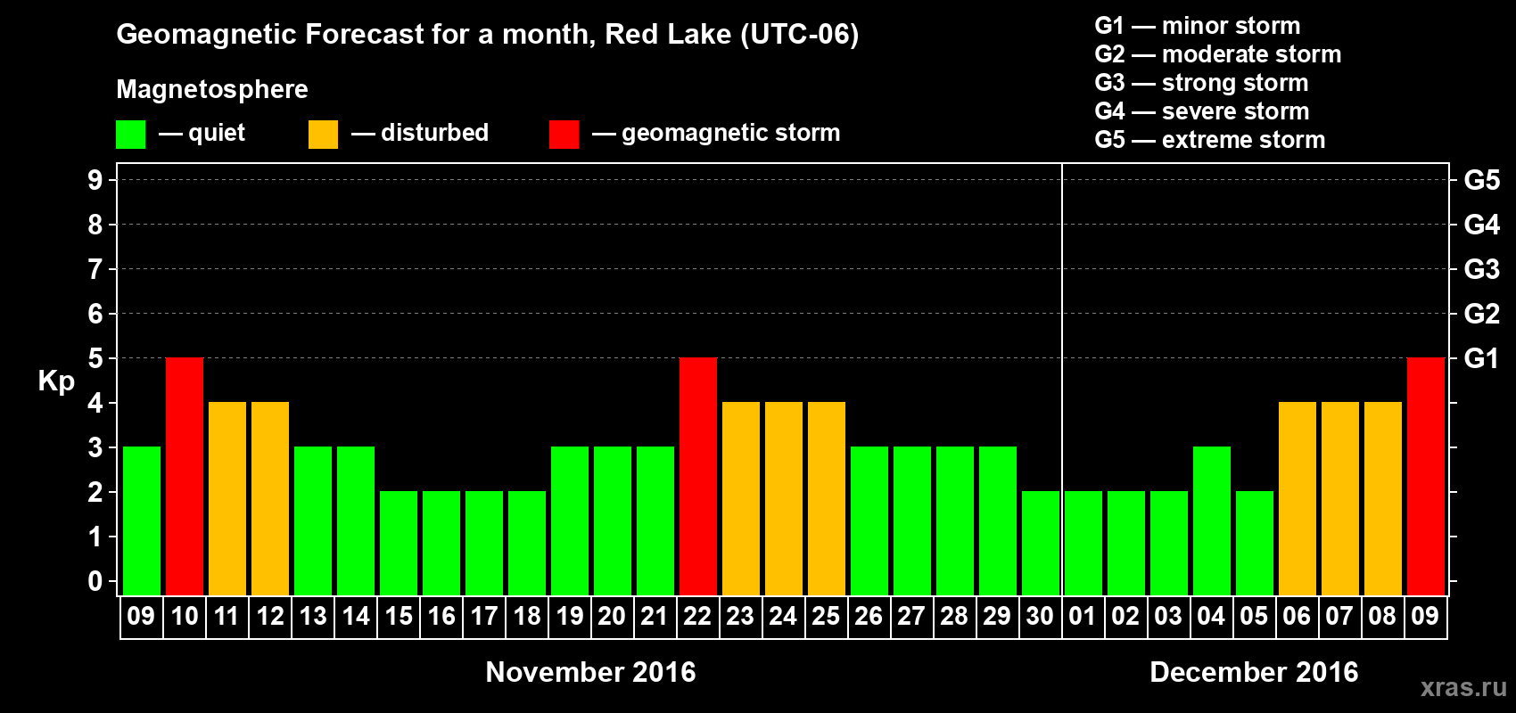 Geomagnetic storm forecast in Red Lake for Nov 09, 2016