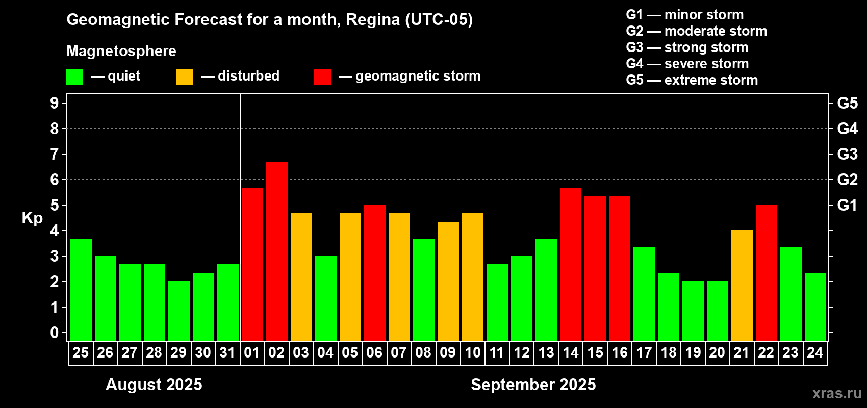 Geomagnetic storm forecast in Regina for Aug 25, 2025