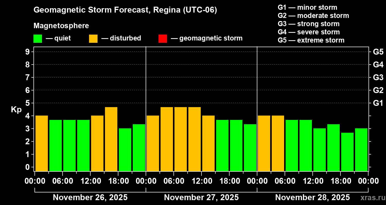 Geomagnetic storm forecast in Regina for Nov 26, 2025