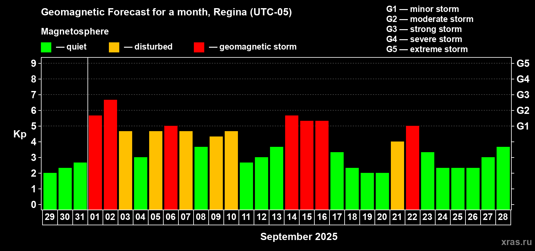 Geomagnetic storm forecast in Regina for Aug 29, 2025