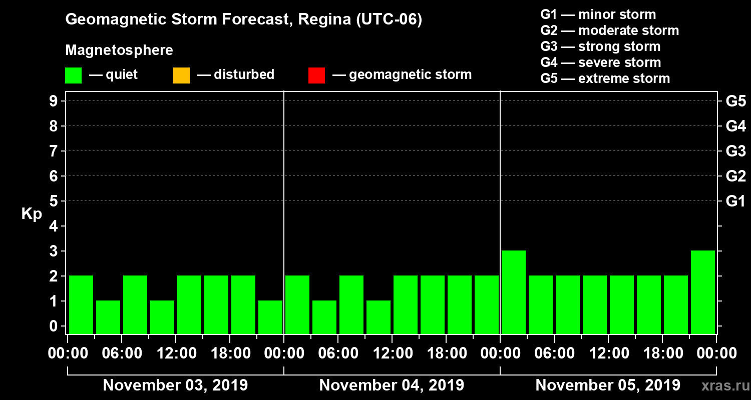 Geomagnetic storm forecast in Regina for Nov 03, 2019