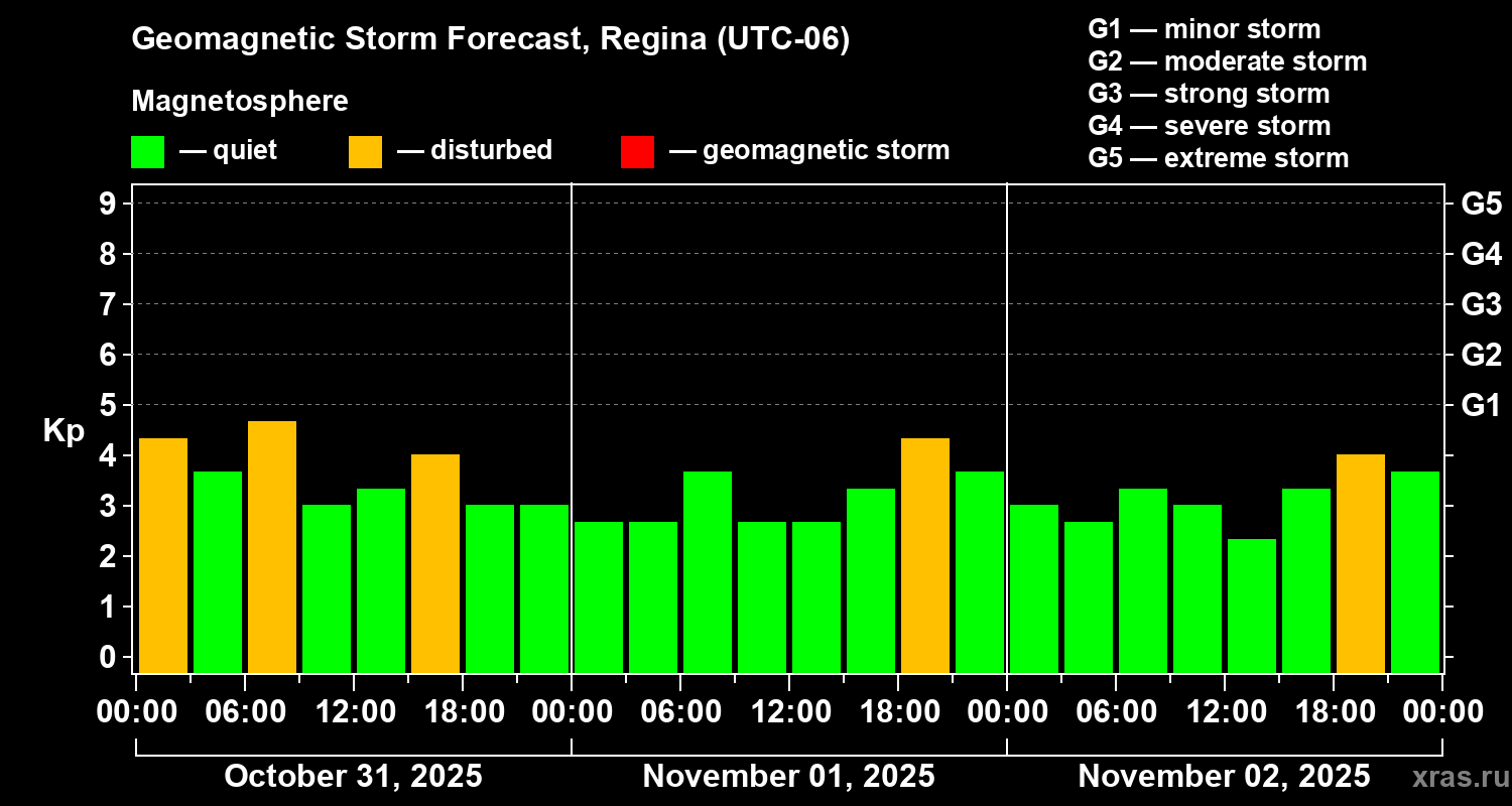 Geomagnetic storm forecast in Regina for Oct 31, 2025