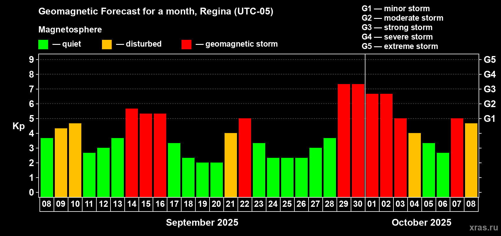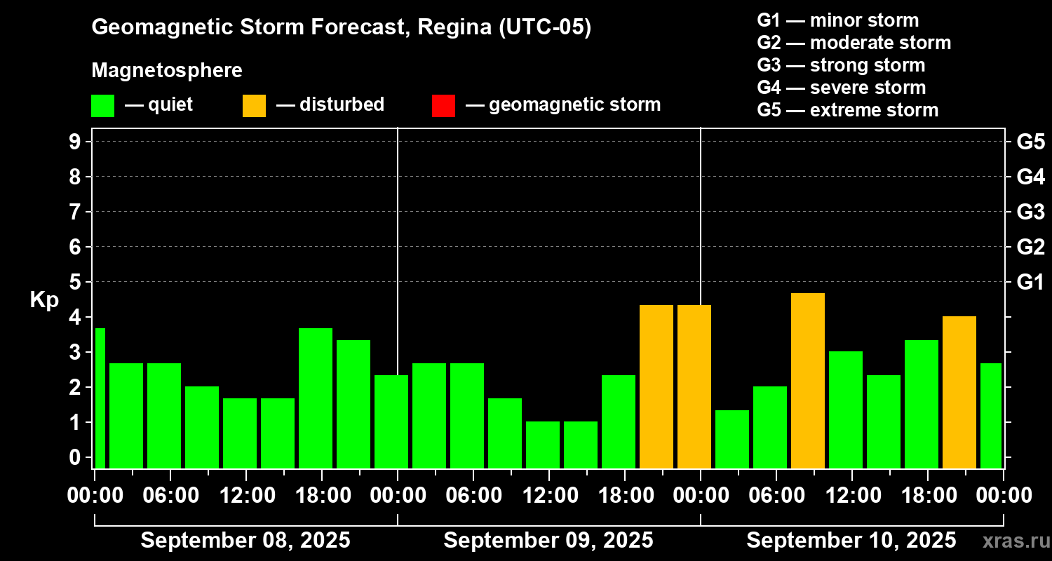 Geomagnetic storm forecast in Regina for Sep 08, 2025
