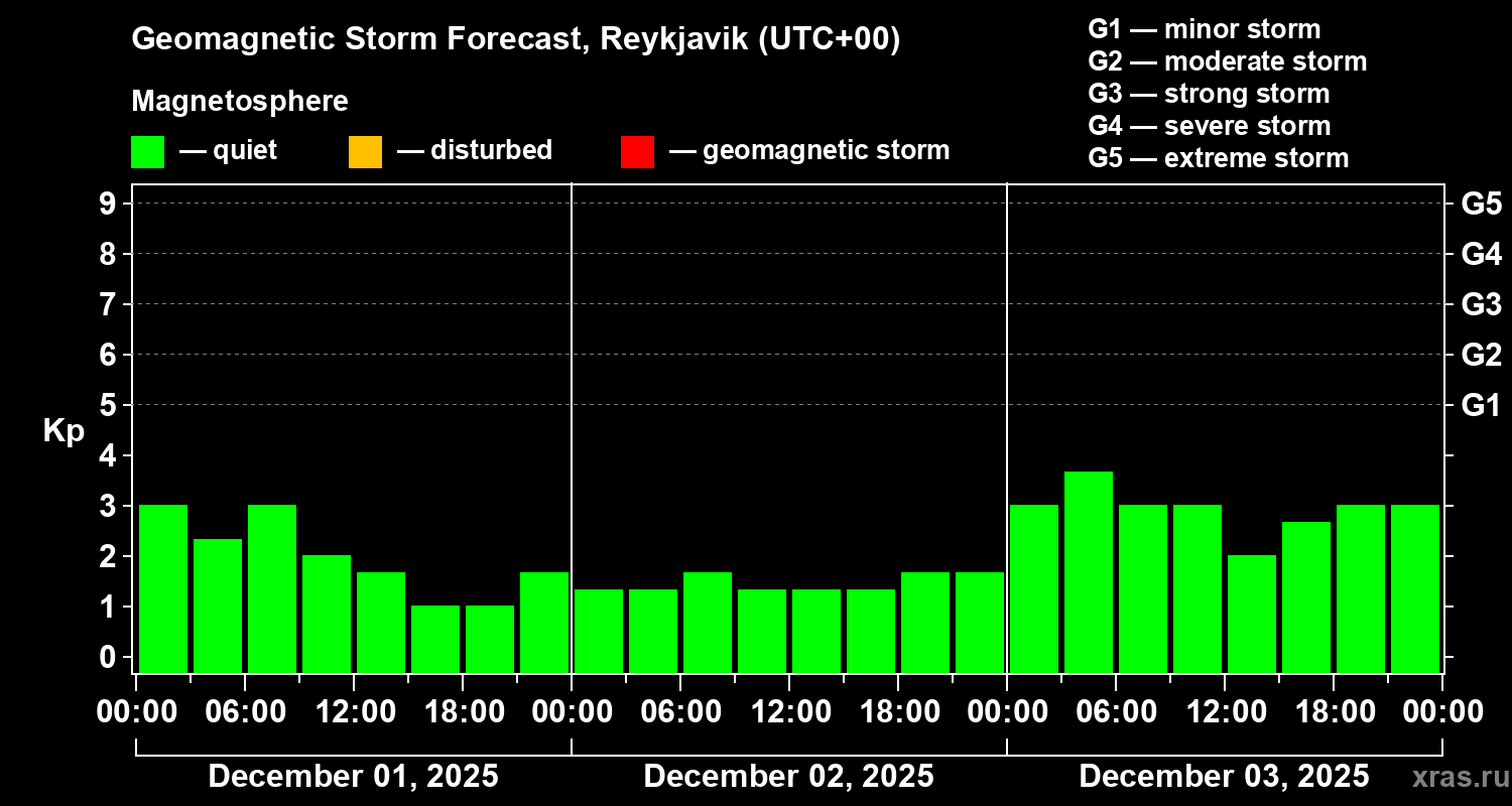 Geomagnetic storm forecast in Reykjavik for Dec 01, 2025