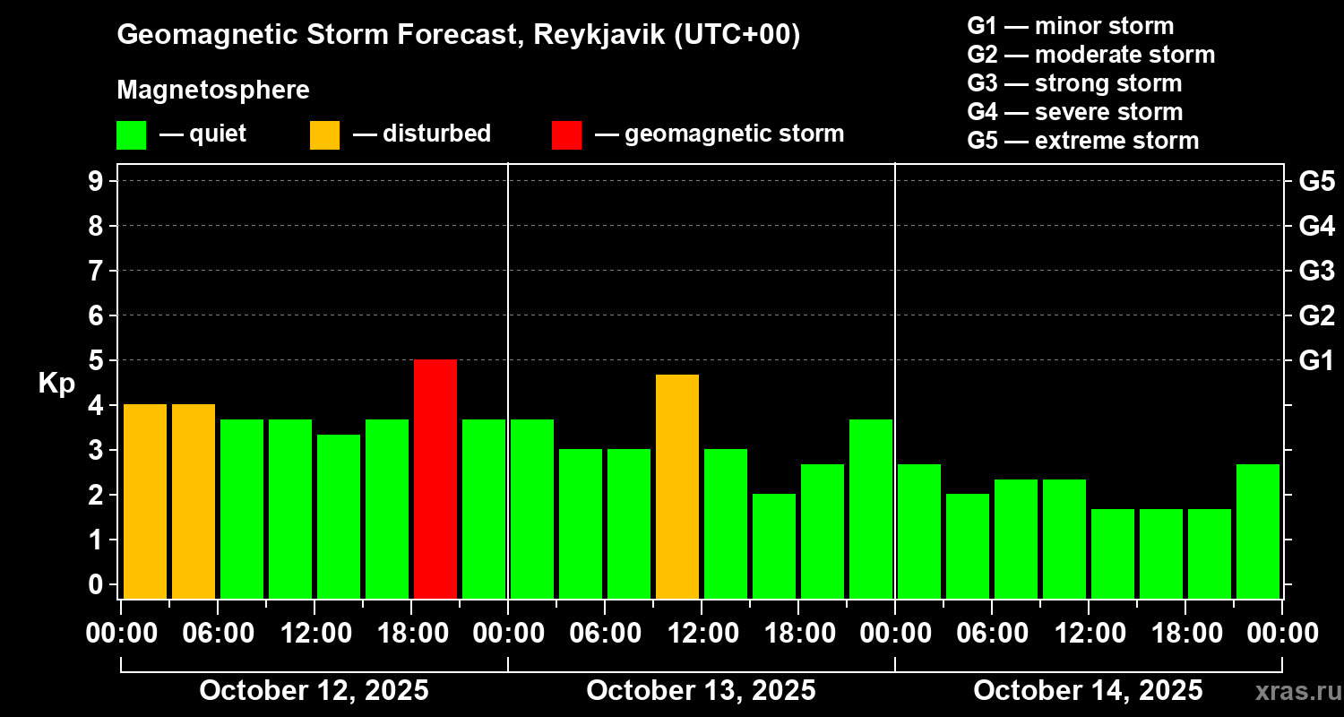 Geomagnetic storm forecast in Reykjavik for Oct 12, 2025