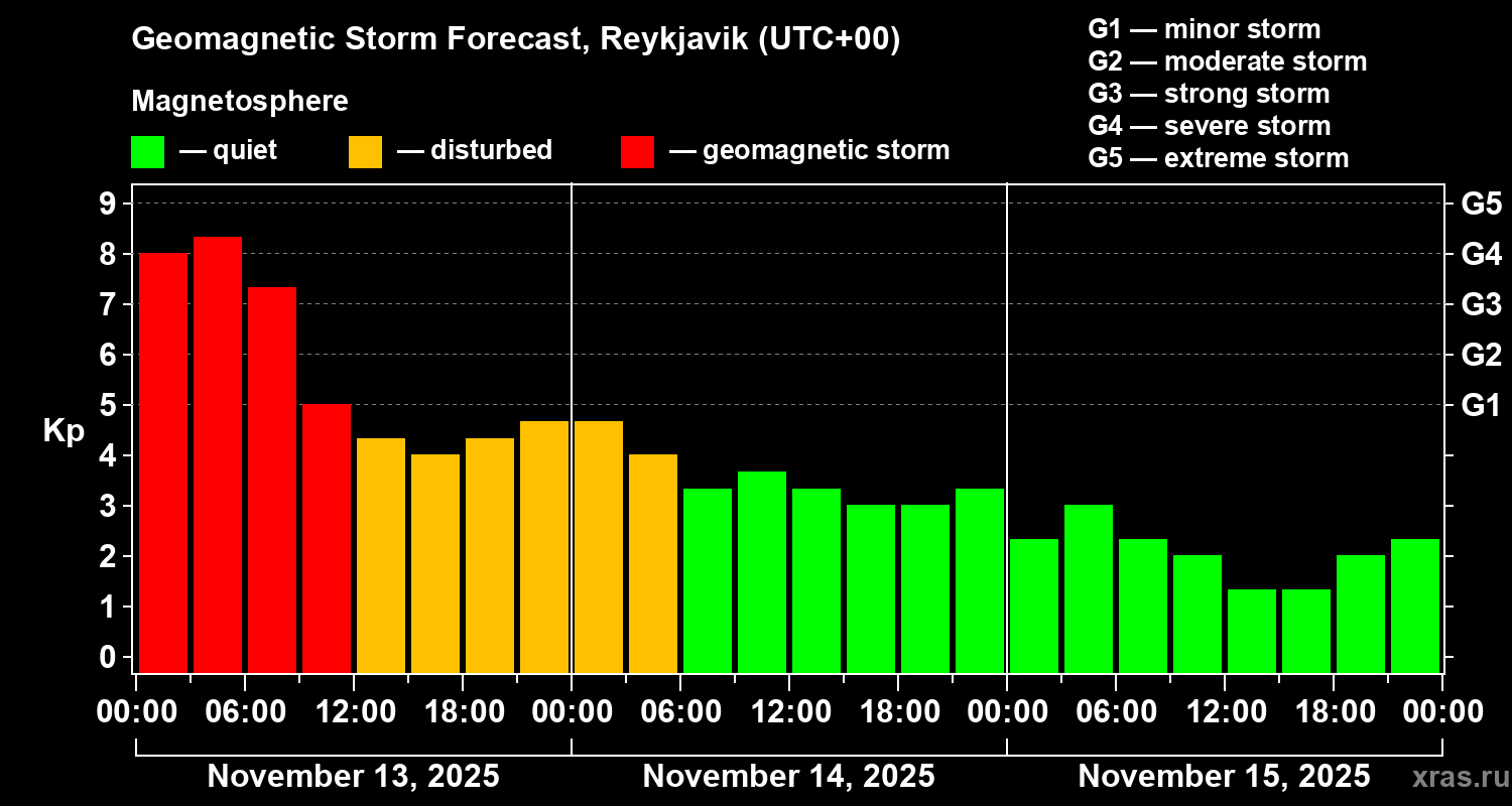 Geomagnetic storm forecast in Reykjavik for Nov 13, 2025