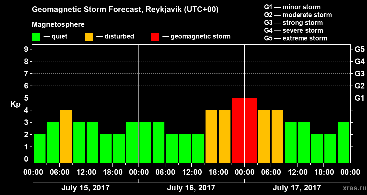 Geomagnetic storm forecast in Reykjavik for Jul 15, 2017
