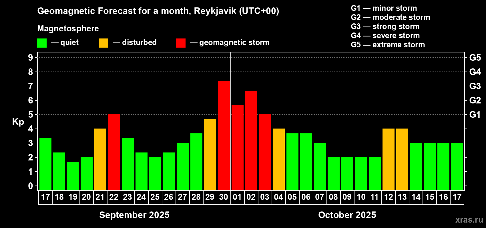 Geomagnetic storm forecast in Reykjavik for Sep 17, 2025
