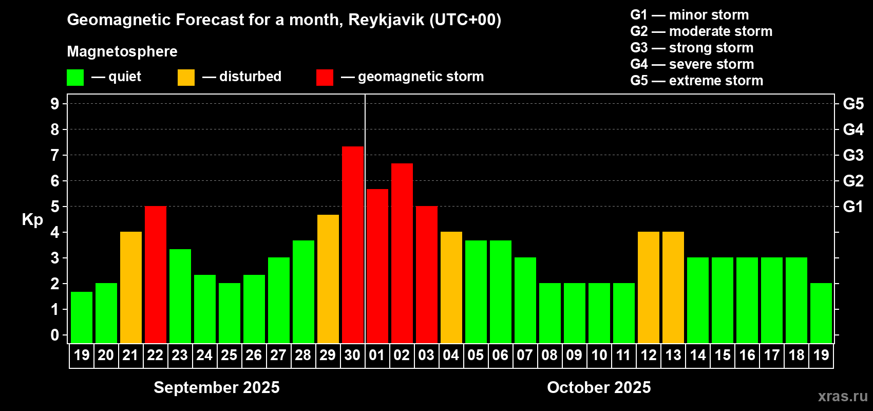 Geomagnetic storm forecast in Reykjavik for Sep 19, 2025