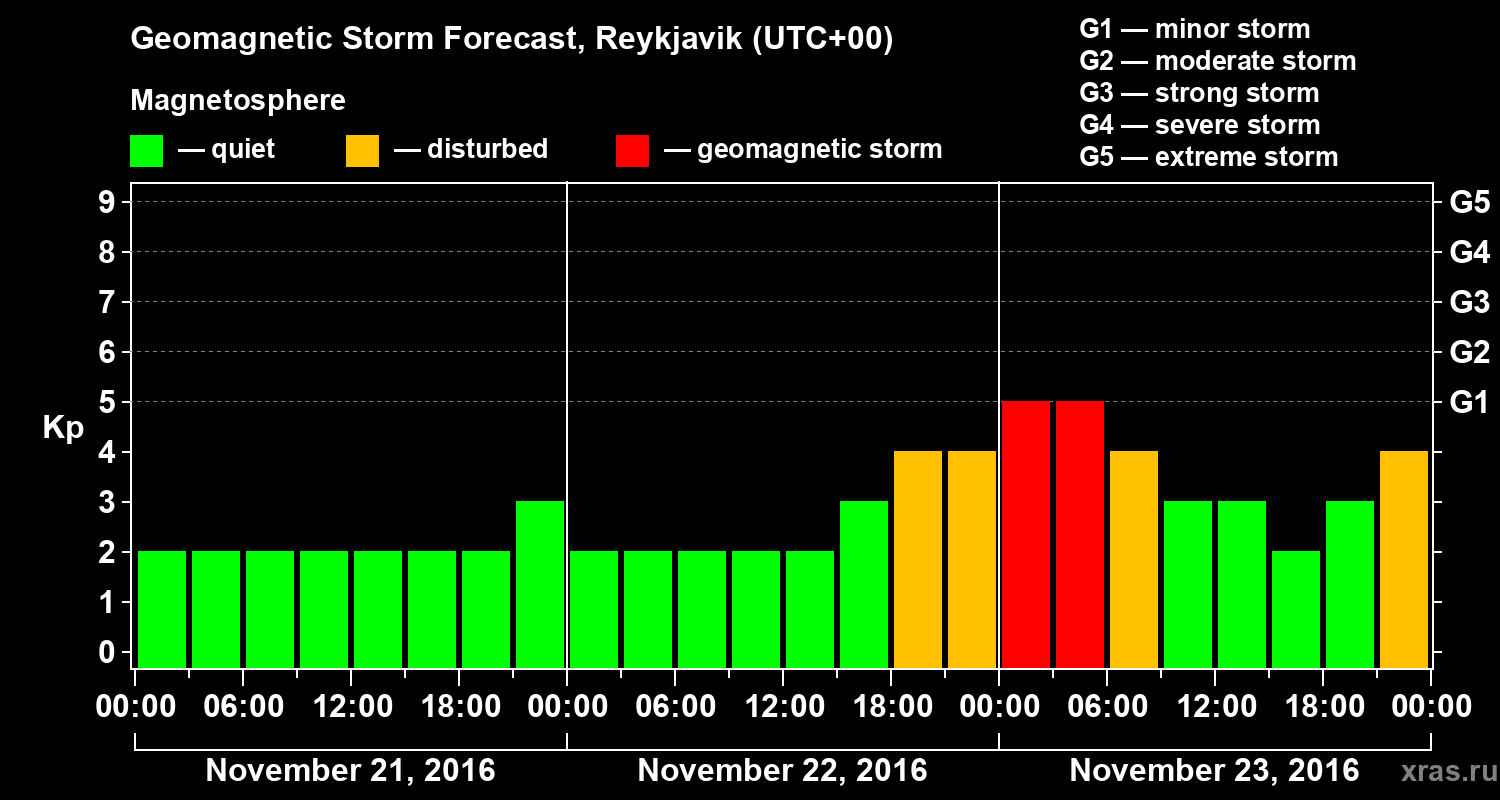 Geomagnetic storm forecast in Reykjavik for Nov 21, 2016