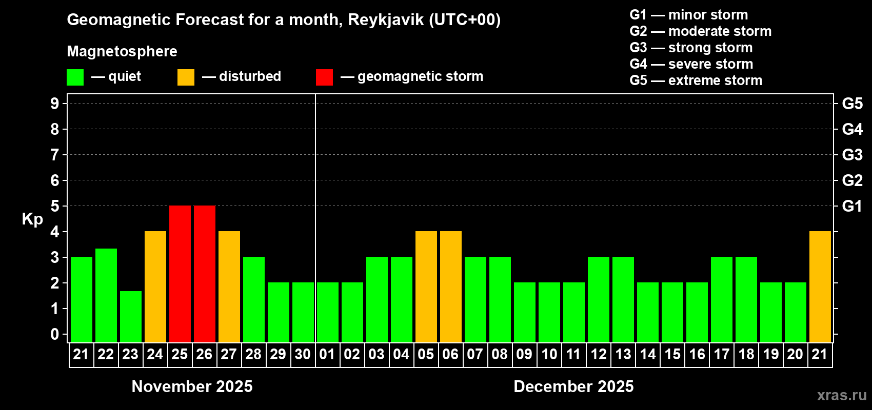 Geomagnetic storm forecast in Reykjavik for Nov 21, 2025