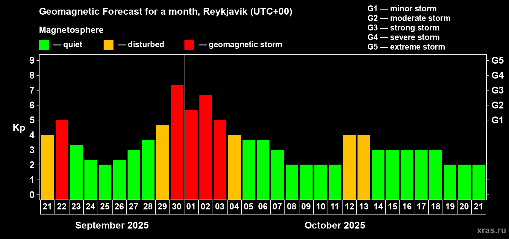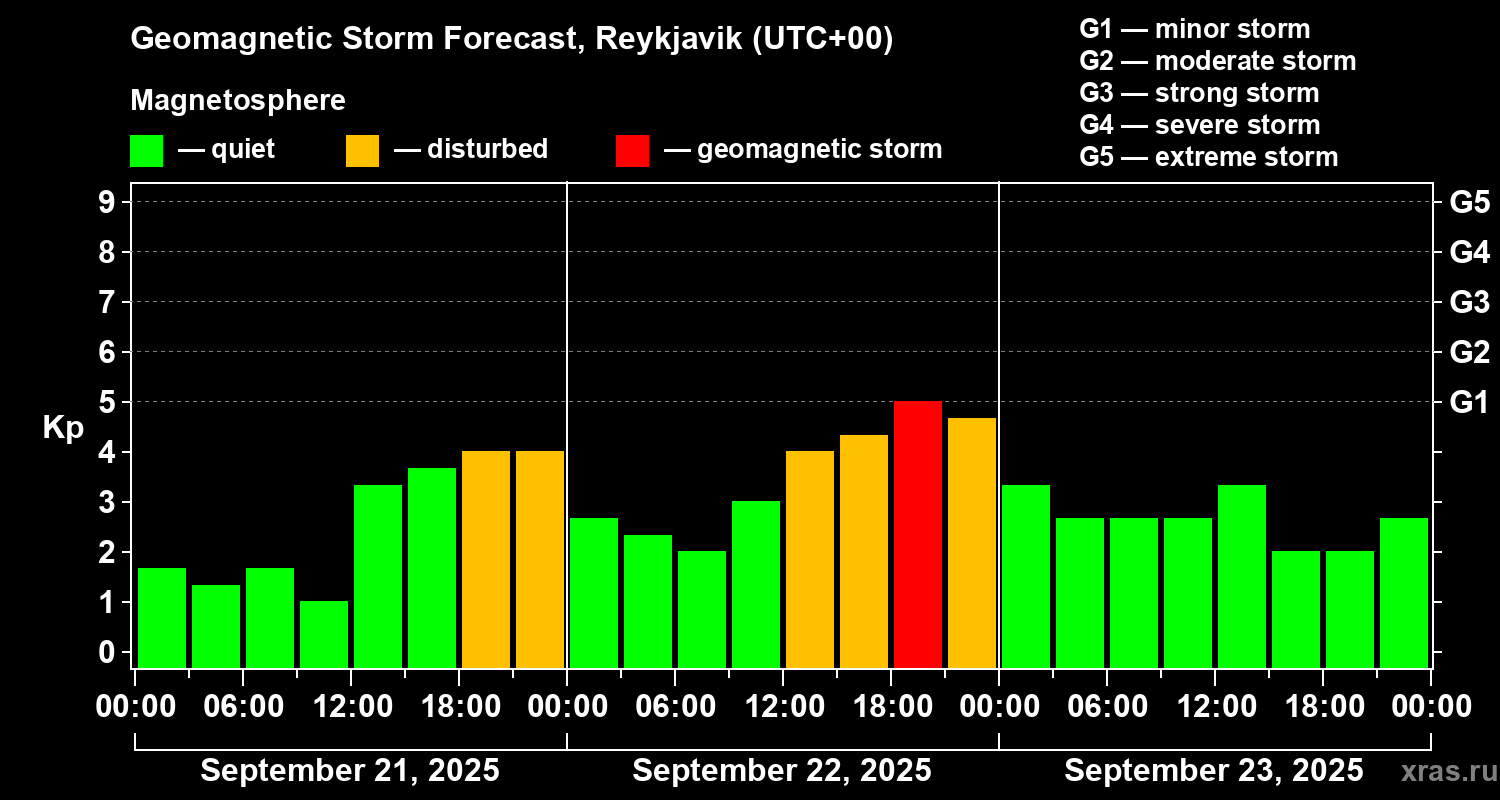 Geomagnetic storm forecast in Reykjavik for Sep 21, 2025