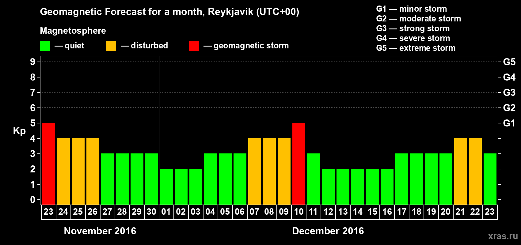 Geomagnetic storm forecast in Reykjavik for Nov 23, 2016
