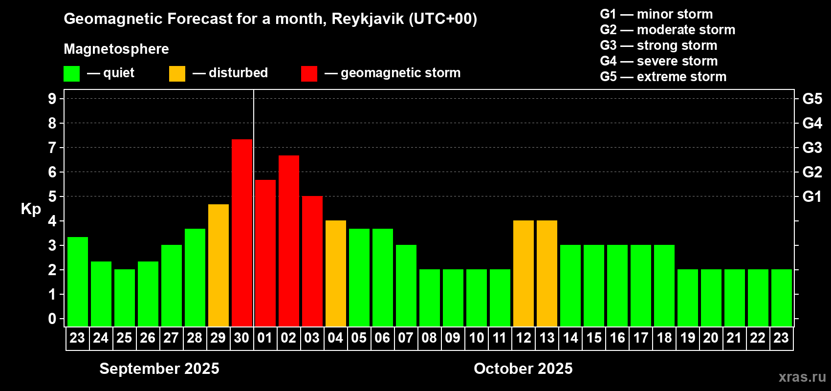Geomagnetic storm forecast in Reykjavik for Sep 23, 2025