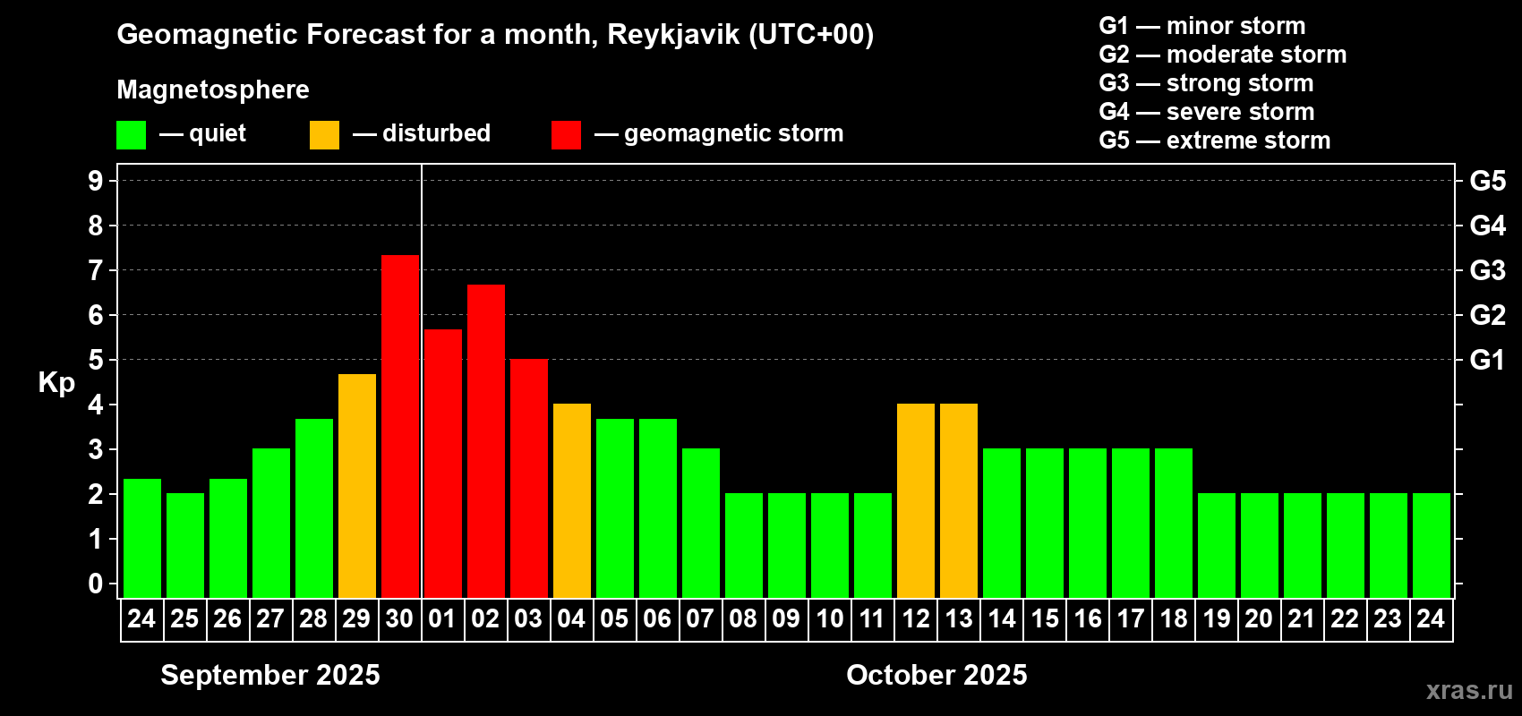 Geomagnetic storm forecast in Reykjavik for Sep 24, 2025