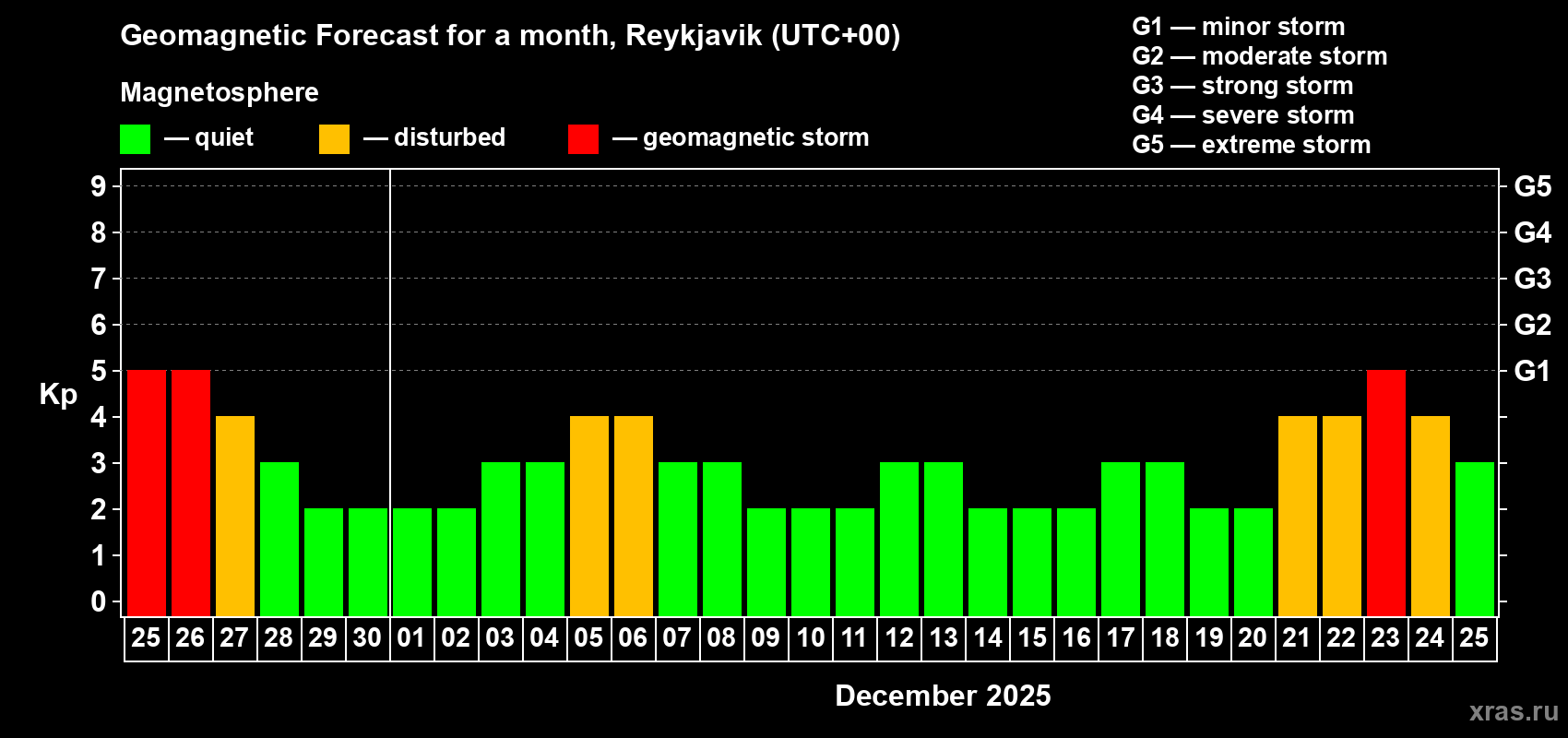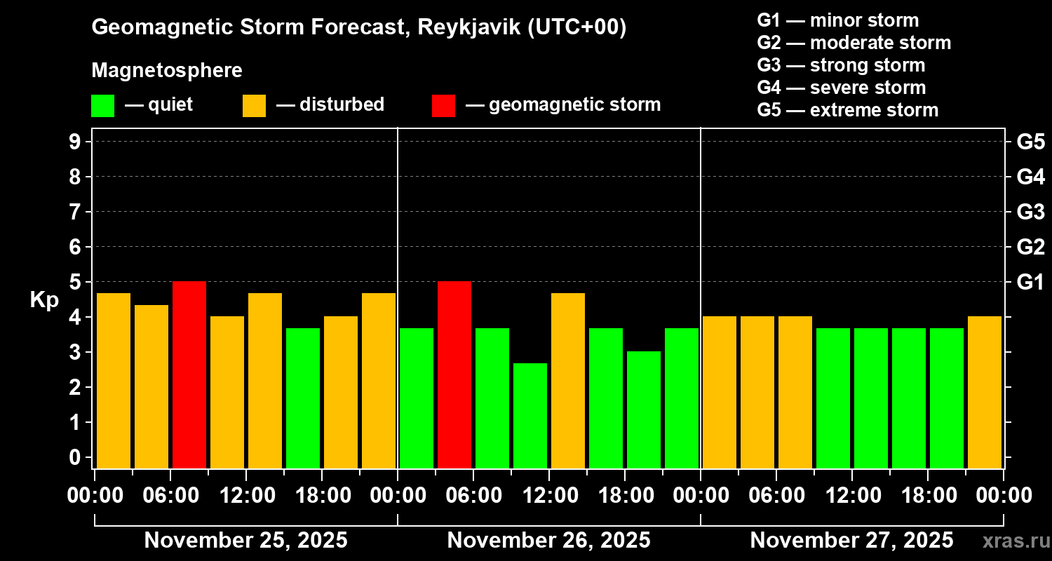 Geomagnetic storm forecast in Reykjavik for Nov 25, 2025
