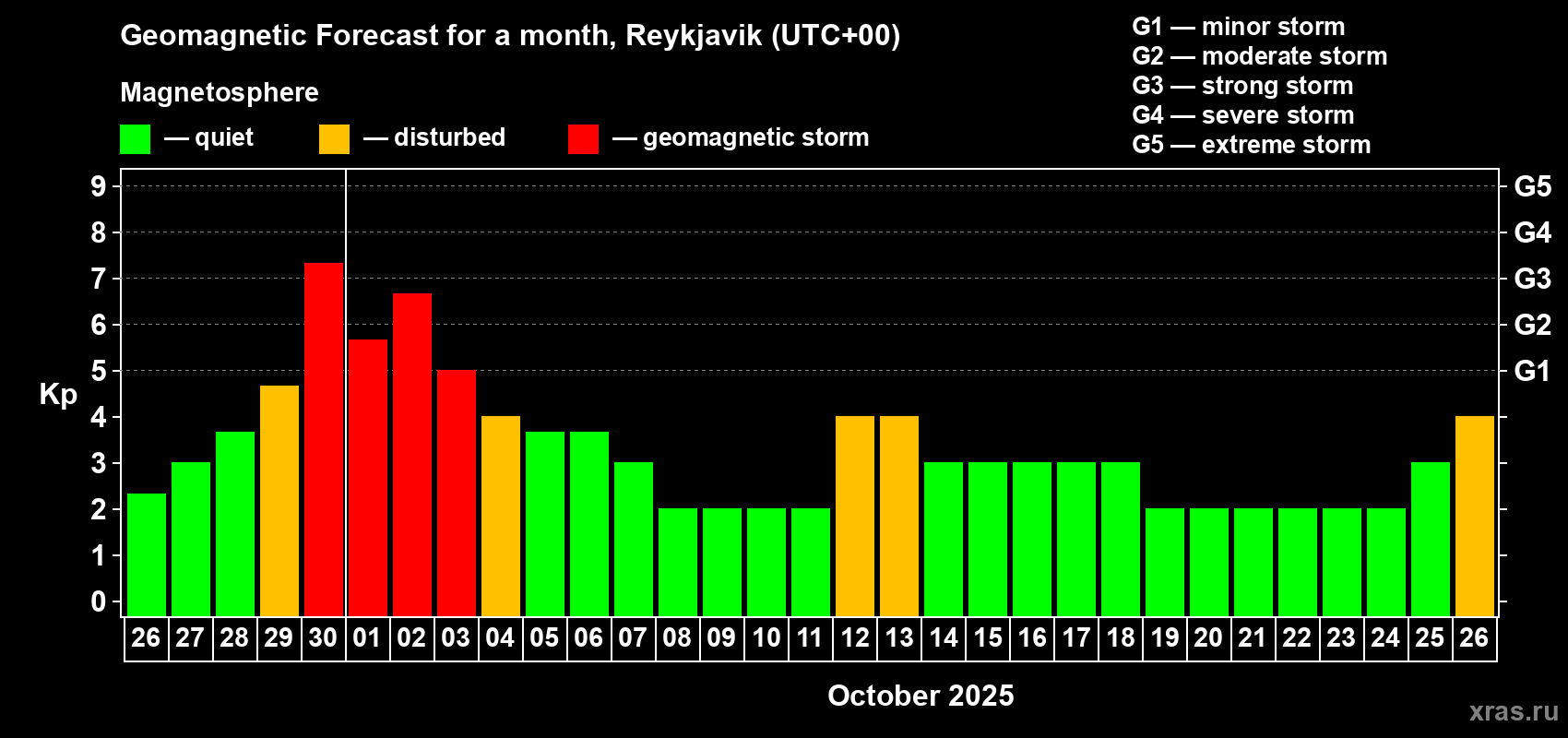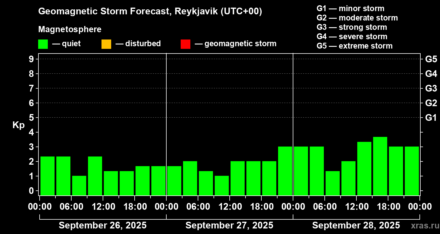 Geomagnetic storm forecast in Reykjavik for Sep 26, 2025