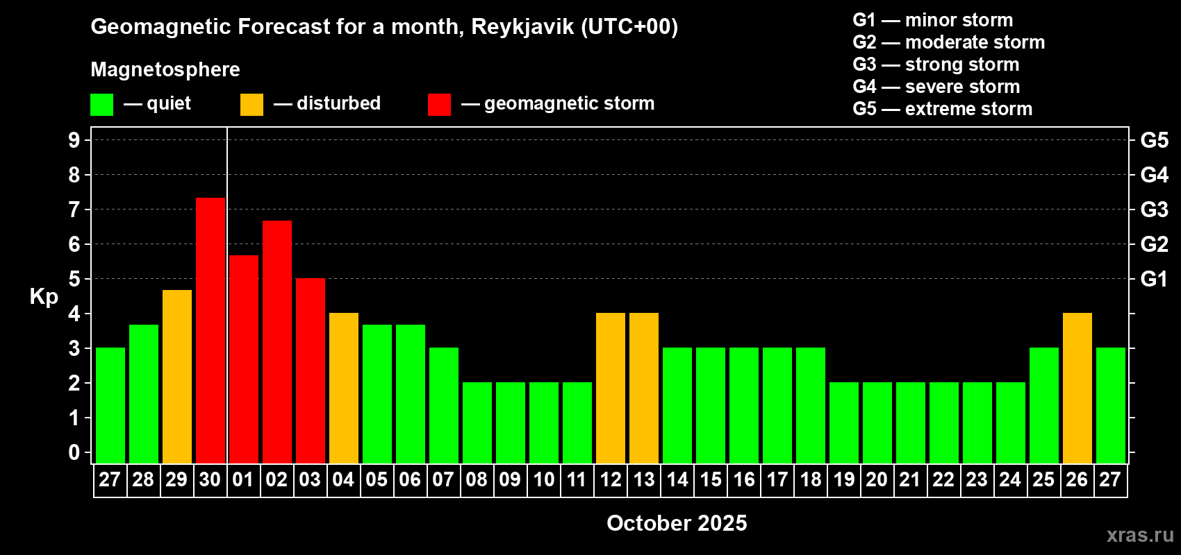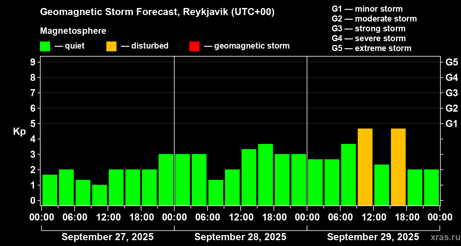 Geomagnetic storm forecast in Reykjavik for Sep 27, 2025