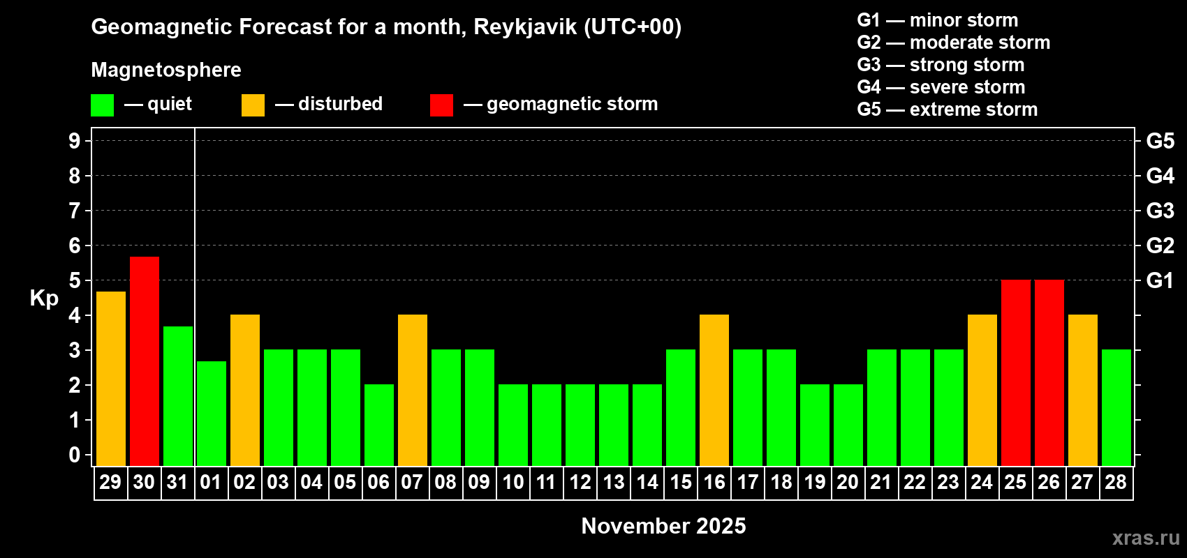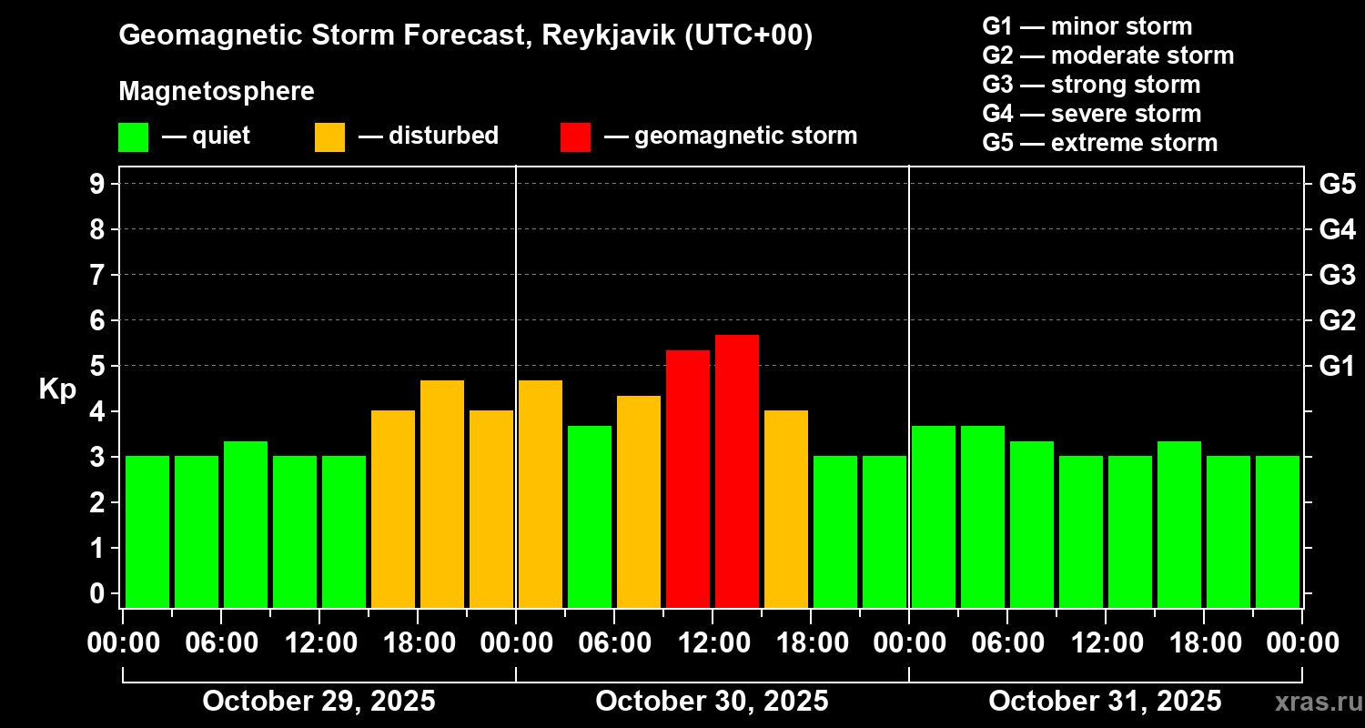 Geomagnetic storm forecast in Reykjavik for Oct 29, 2025