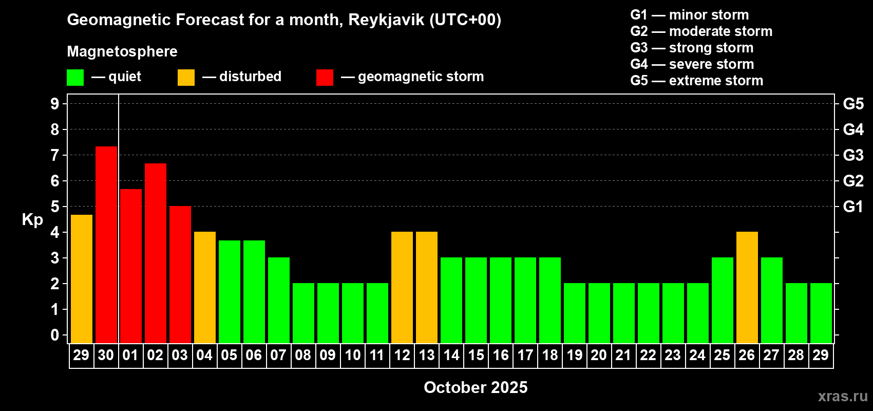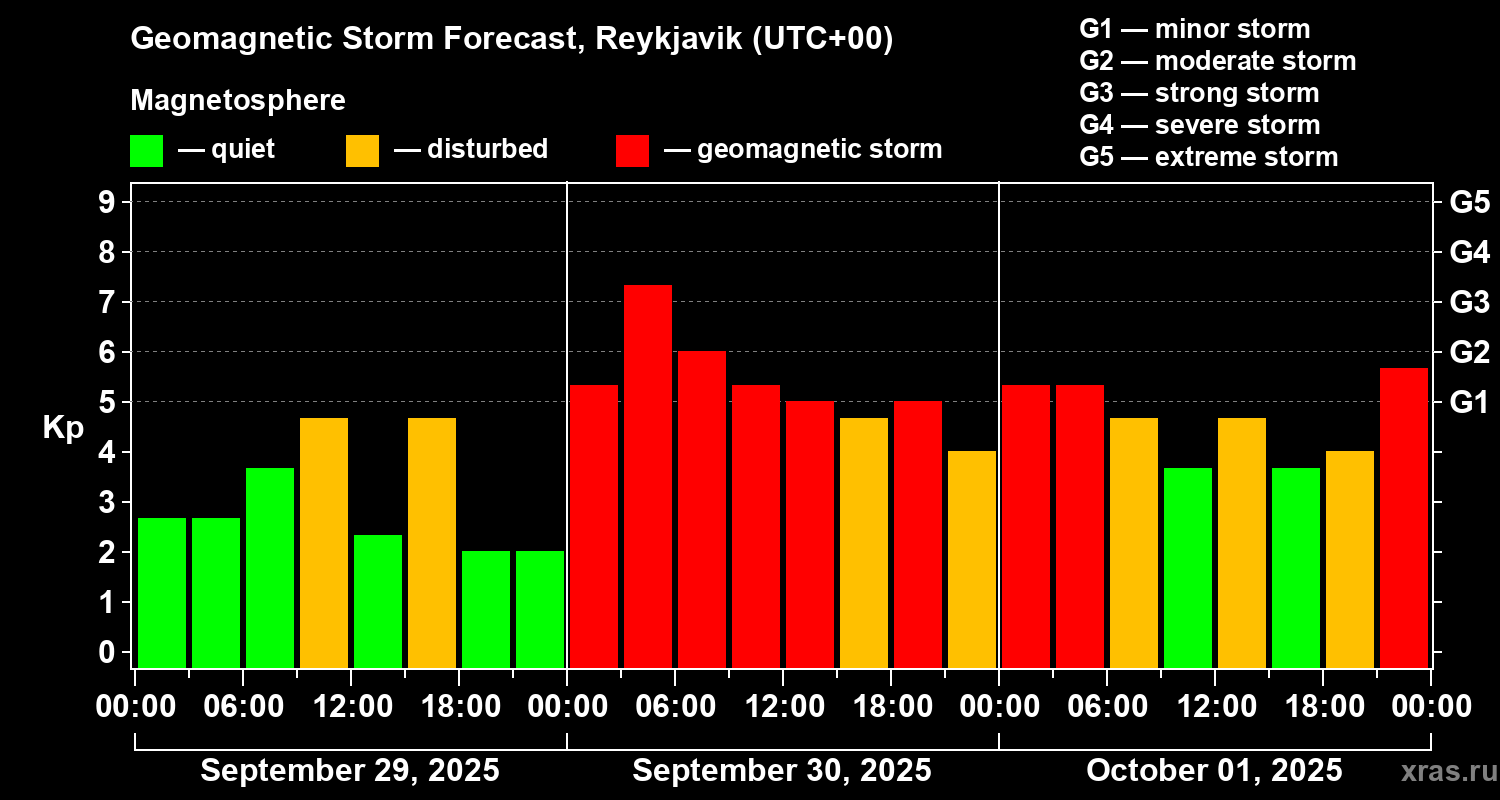 Geomagnetic storm forecast in Reykjavik for Sep 29, 2025