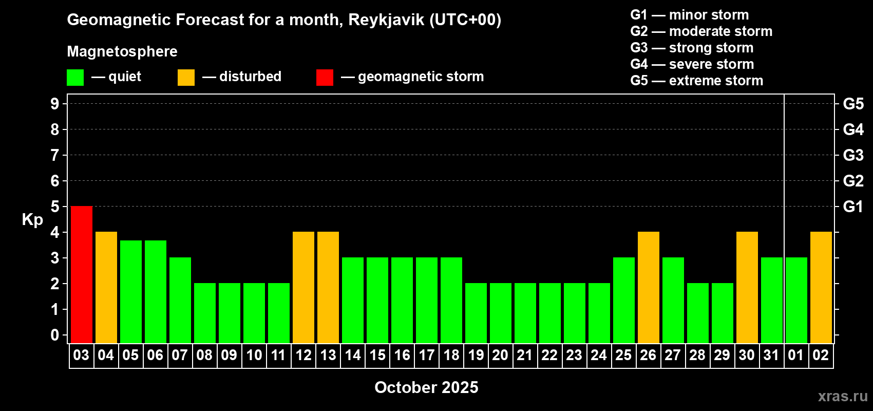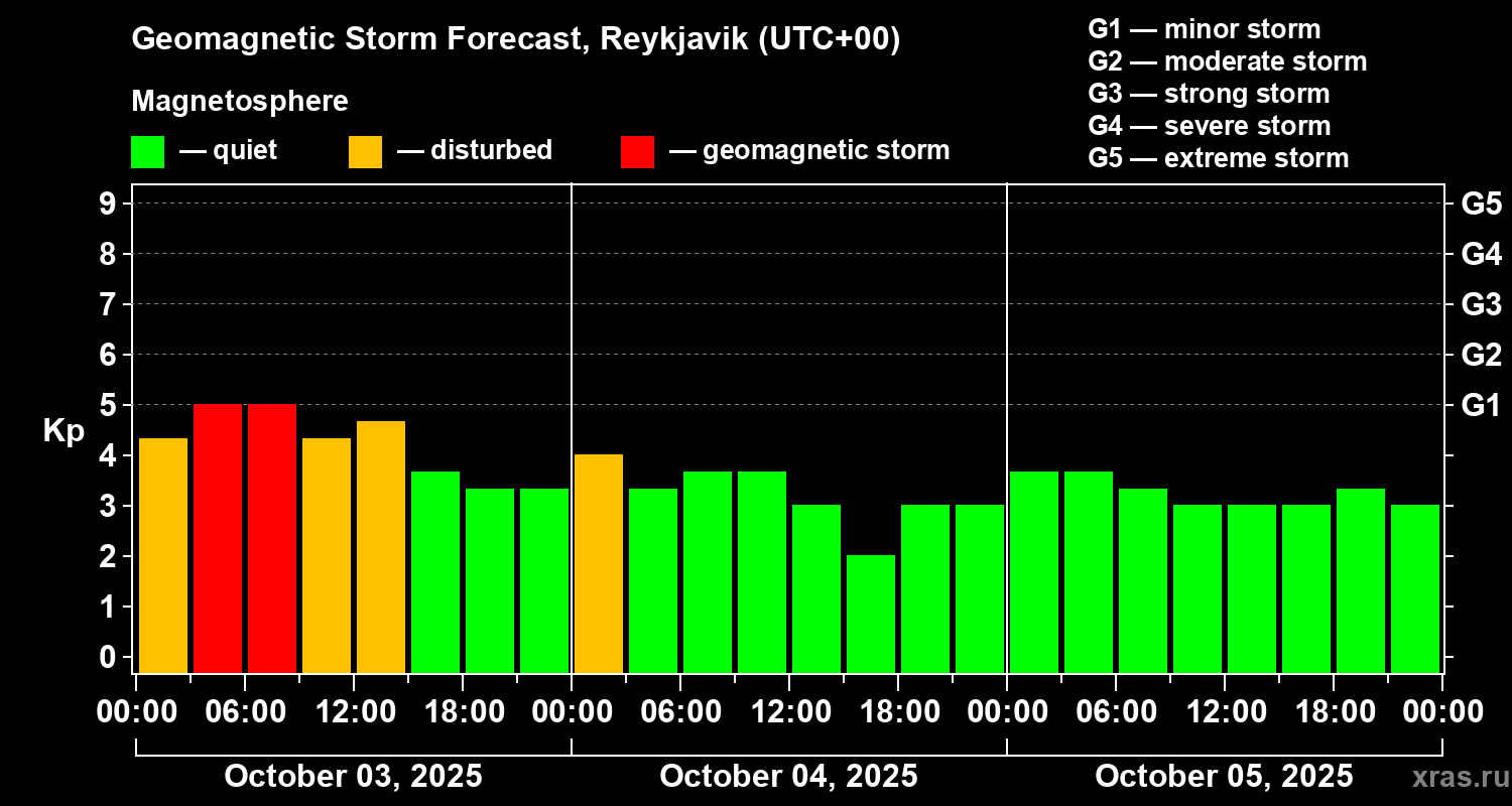 Geomagnetic storm forecast in Reykjavik for Oct 03, 2025