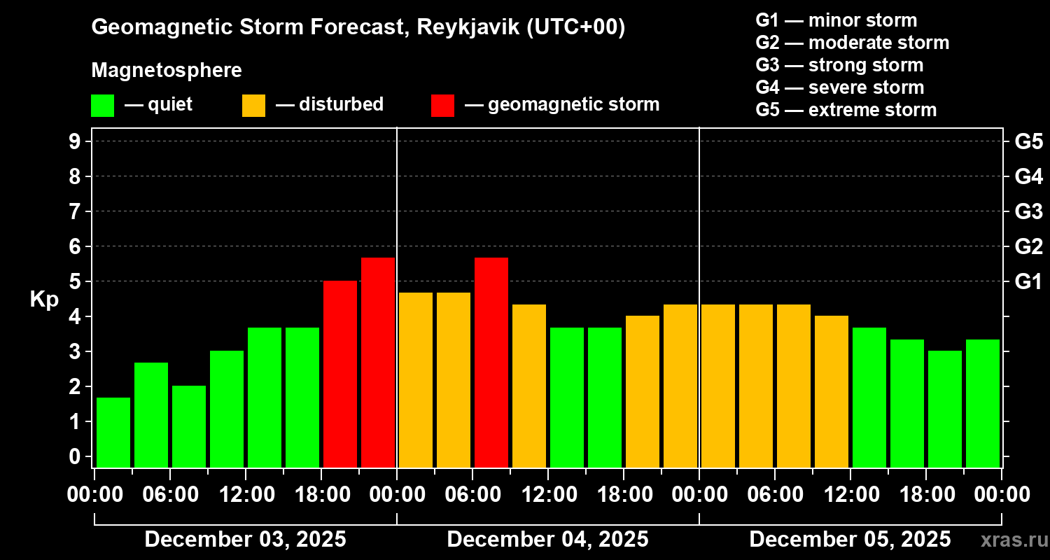 Geomagnetic storm forecast in Reykjavik for Dec 03, 2025