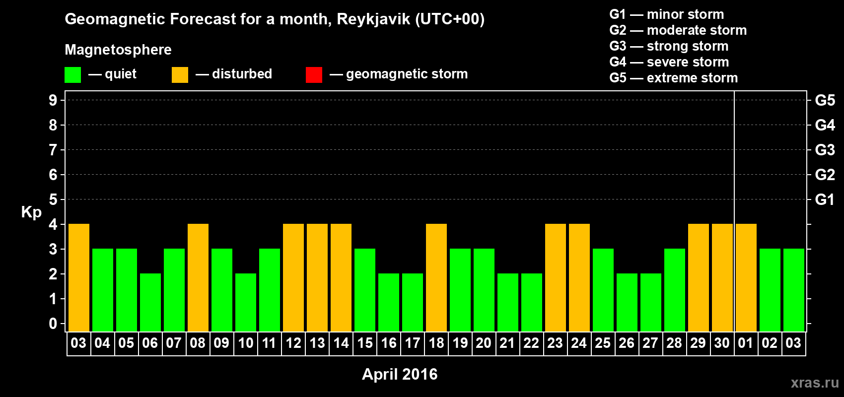 Geomagnetic storm forecast in Reykjavik for Apr 03, 2016
