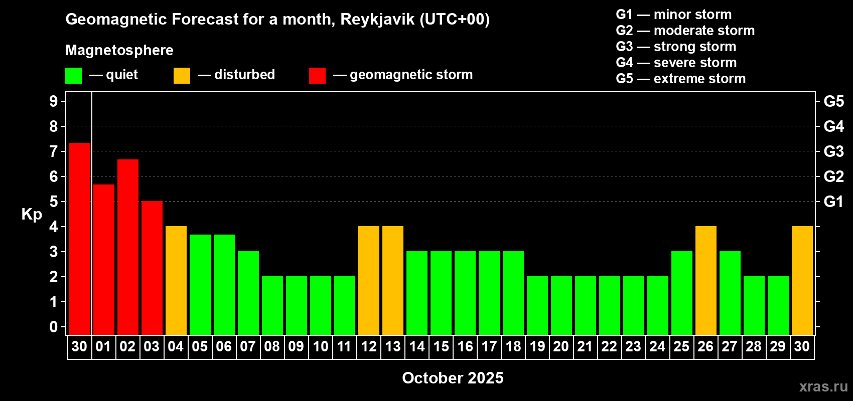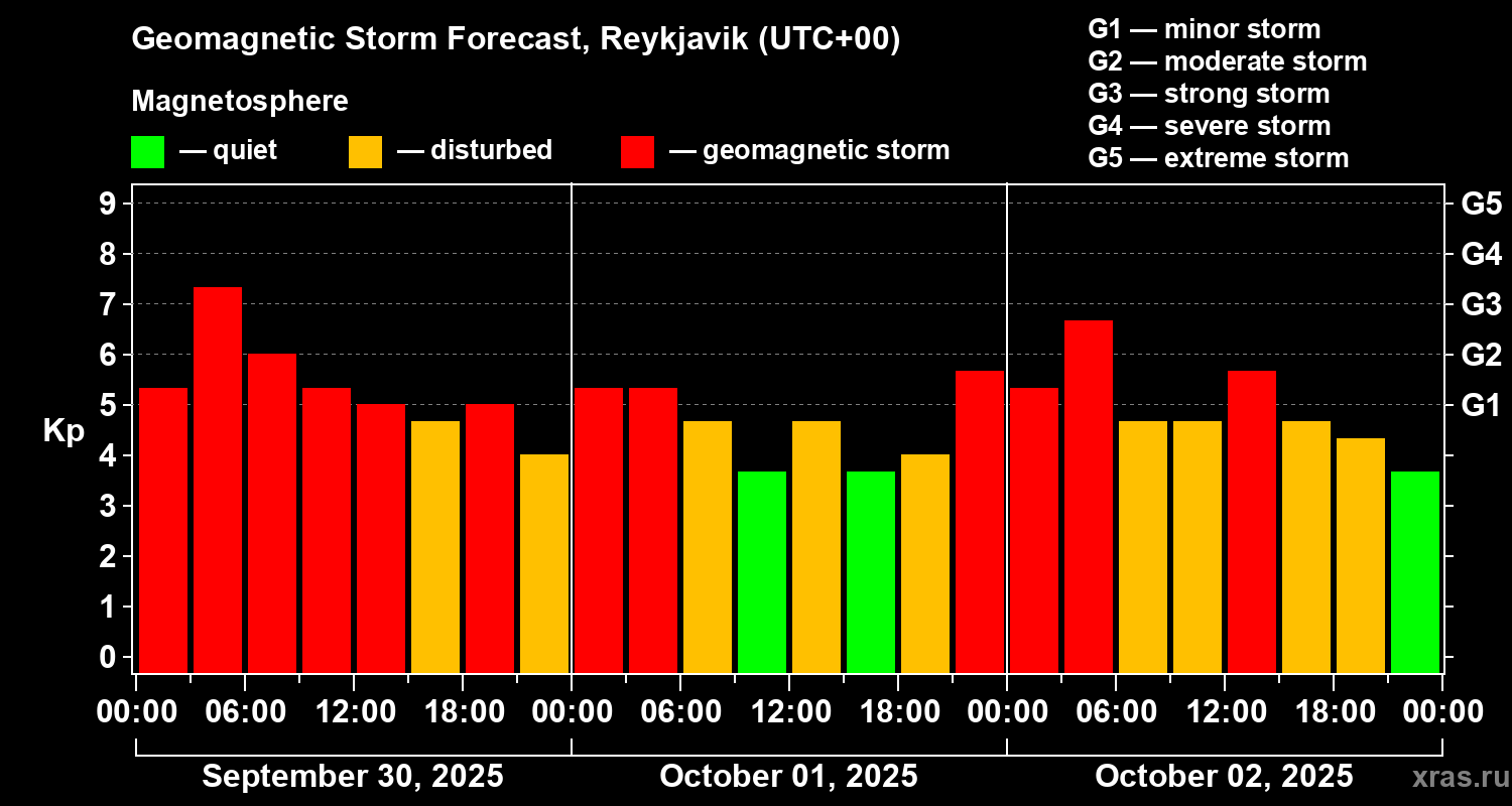 Geomagnetic storm forecast in Reykjavik for Sep 30, 2025