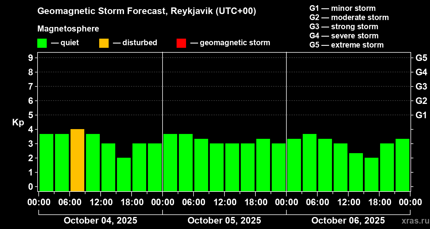 Geomagnetic storm forecast in Reykjavik for Oct 04, 2025