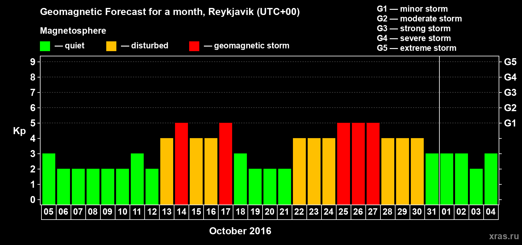 Geomagnetic storm forecast in Reykjavik for Oct 05, 2016