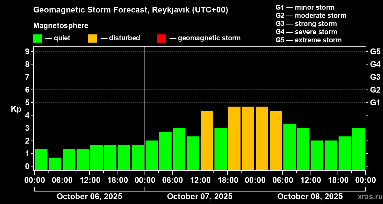 Geomagnetic storm forecast in Reykjavik for Oct 06, 2025