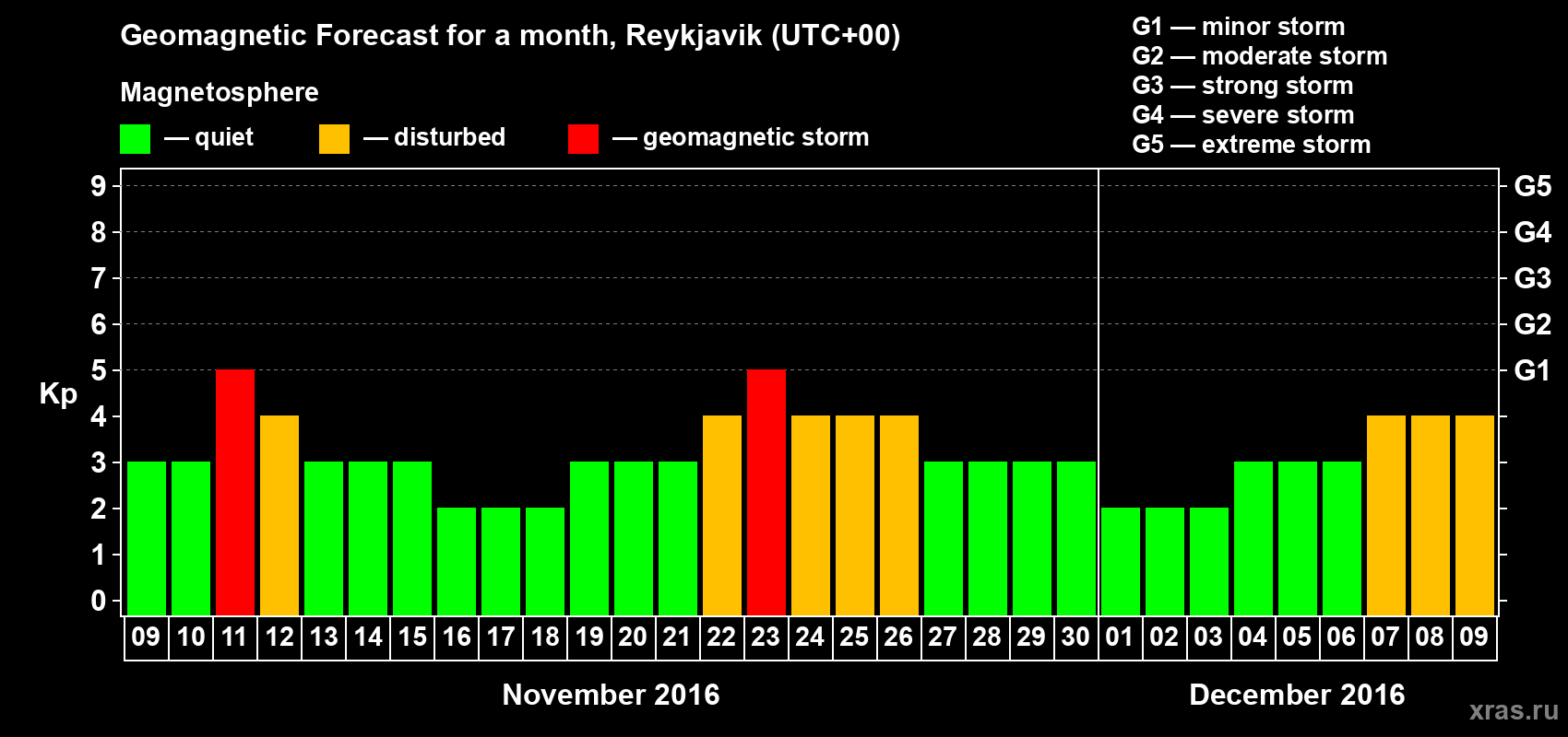 Geomagnetic storm forecast in Reykjavik for Nov 09, 2016