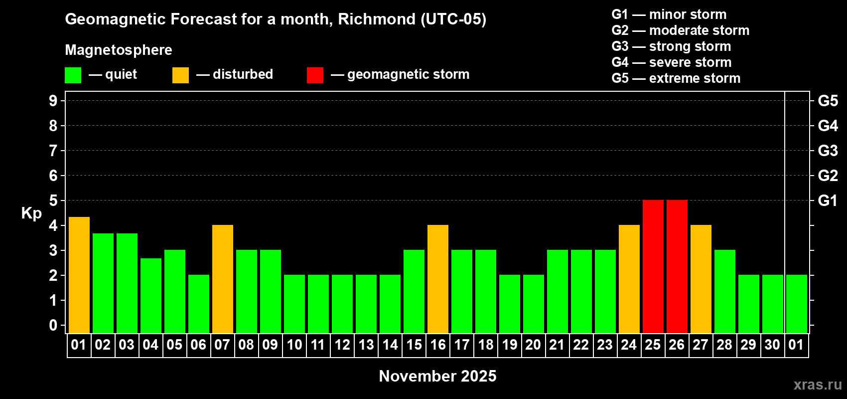 Geomagnetic storm forecast in Richmond for Nov 01, 2025