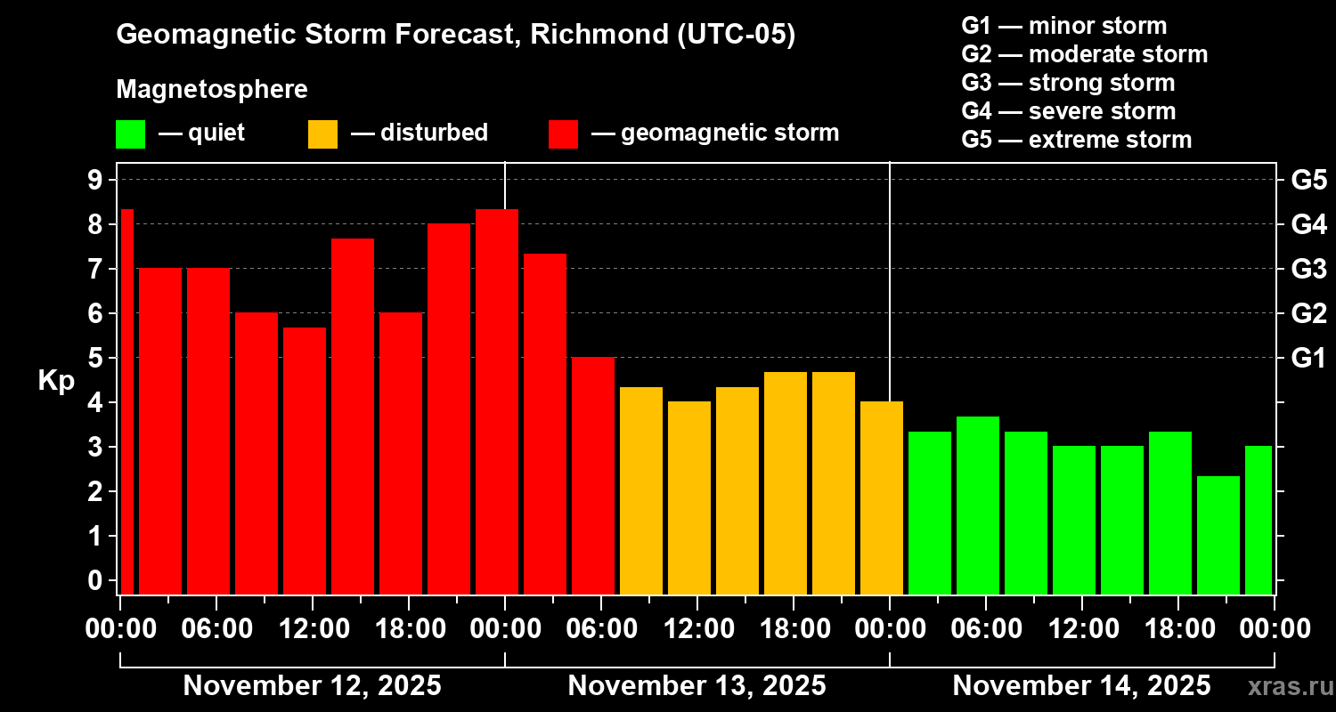 Geomagnetic storm forecast in Richmond for Nov 12, 2025