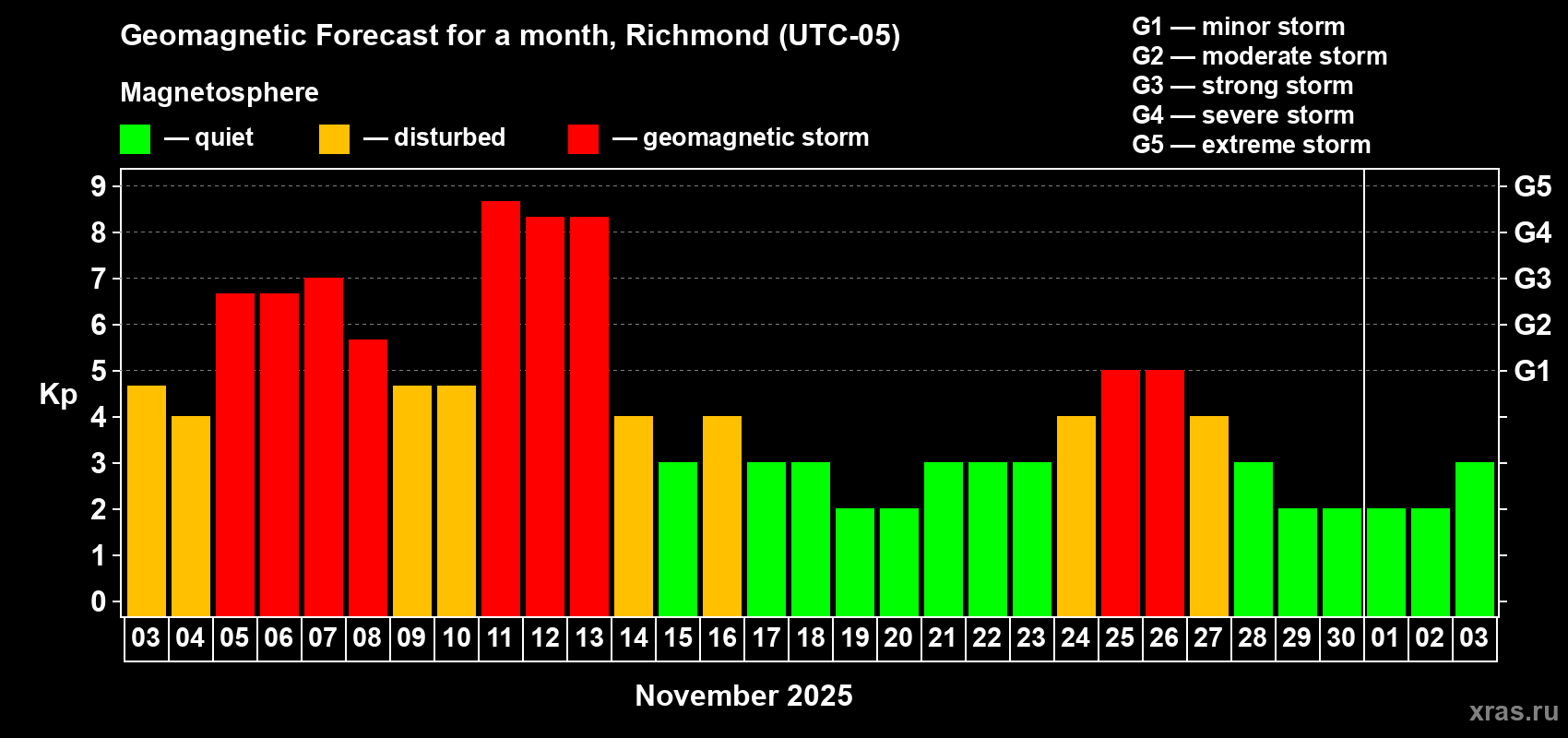 Geomagnetic storm forecast in Richmond for Nov 03, 2025