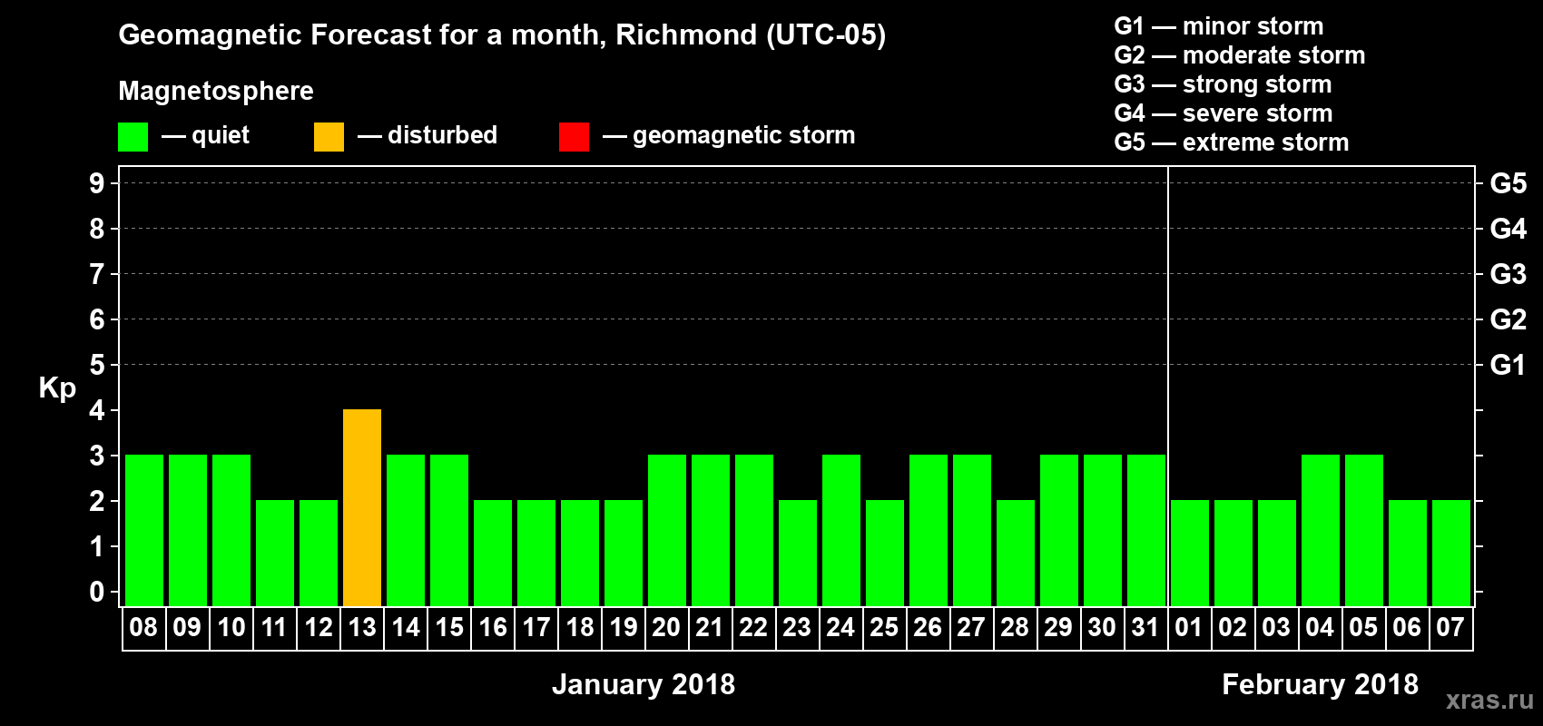 Geomagnetic storm forecast in Richmond for Jan 08, 2018