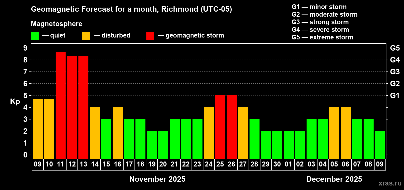 Geomagnetic storm forecast in Richmond for Nov 09, 2025