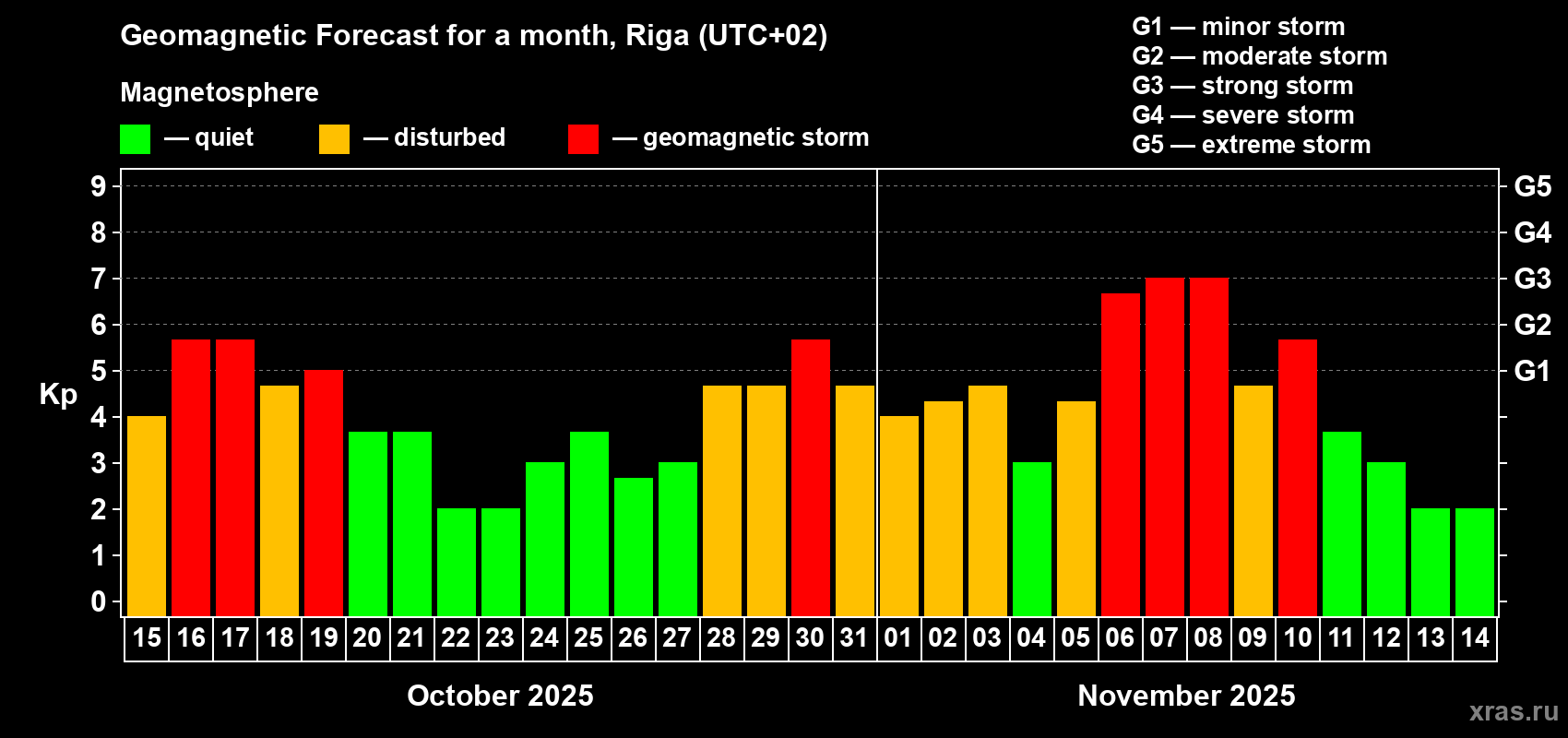 Geomagnetic storm forecast in Riga for Oct 15, 2025