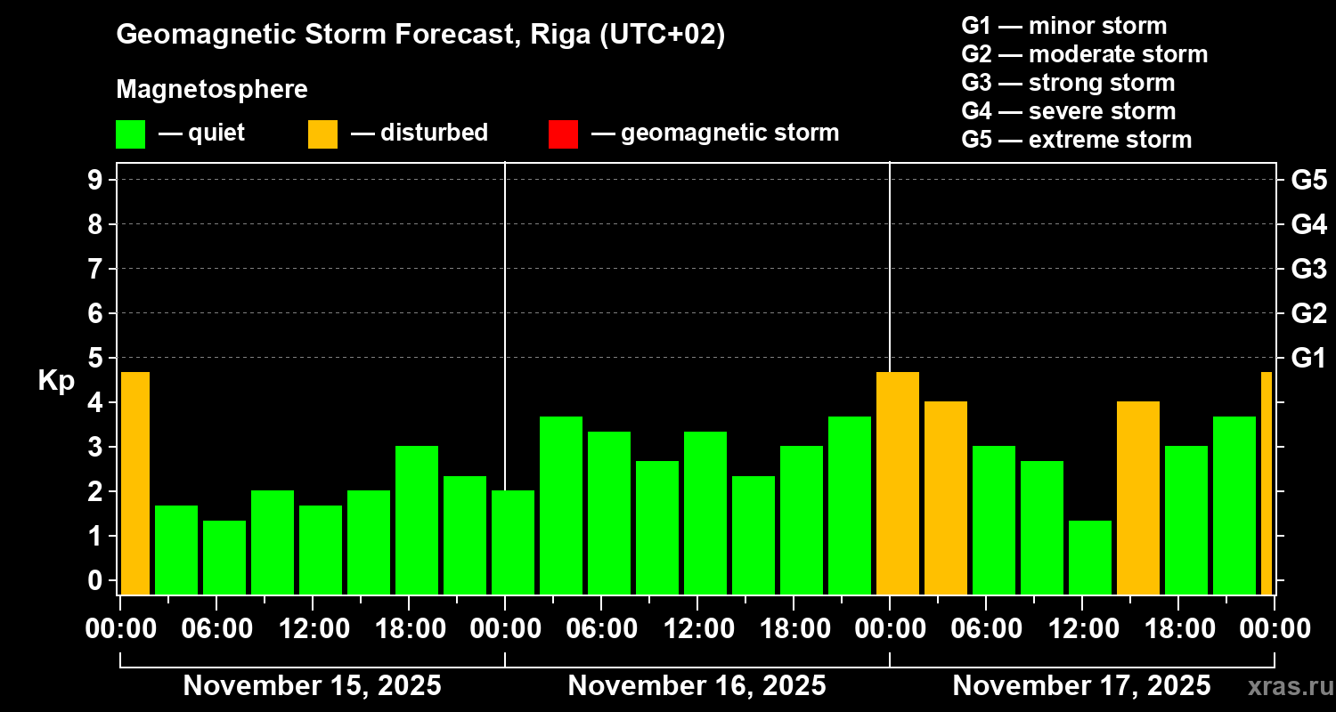 Geomagnetic storm forecast in Riga for Nov 15, 2025
