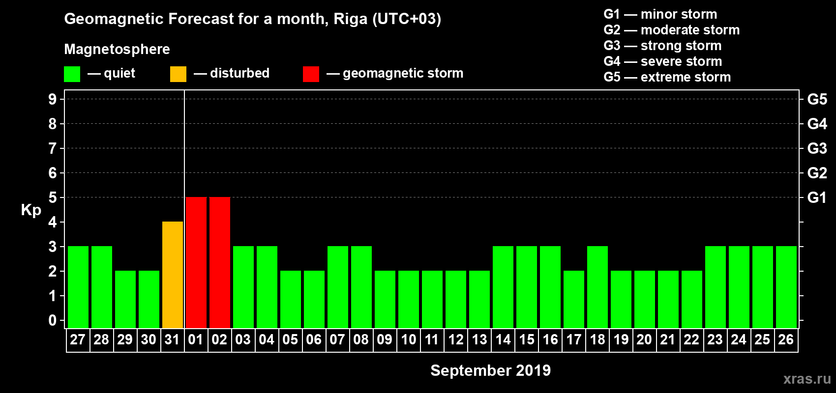 Geomagnetic storm forecast in Riga for Aug 27, 2019