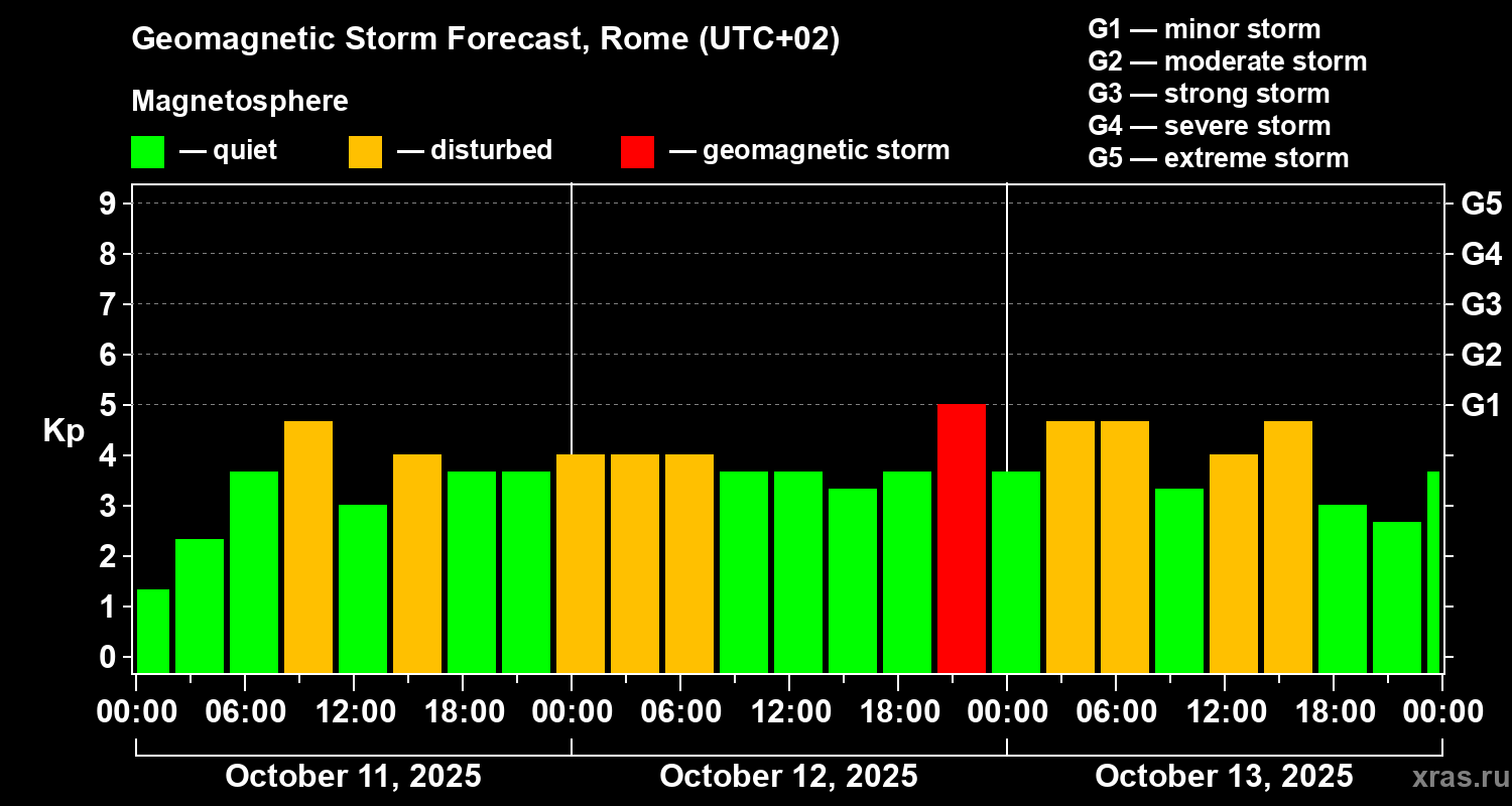 Geomagnetic storm forecast in Rome for Oct 11, 2025