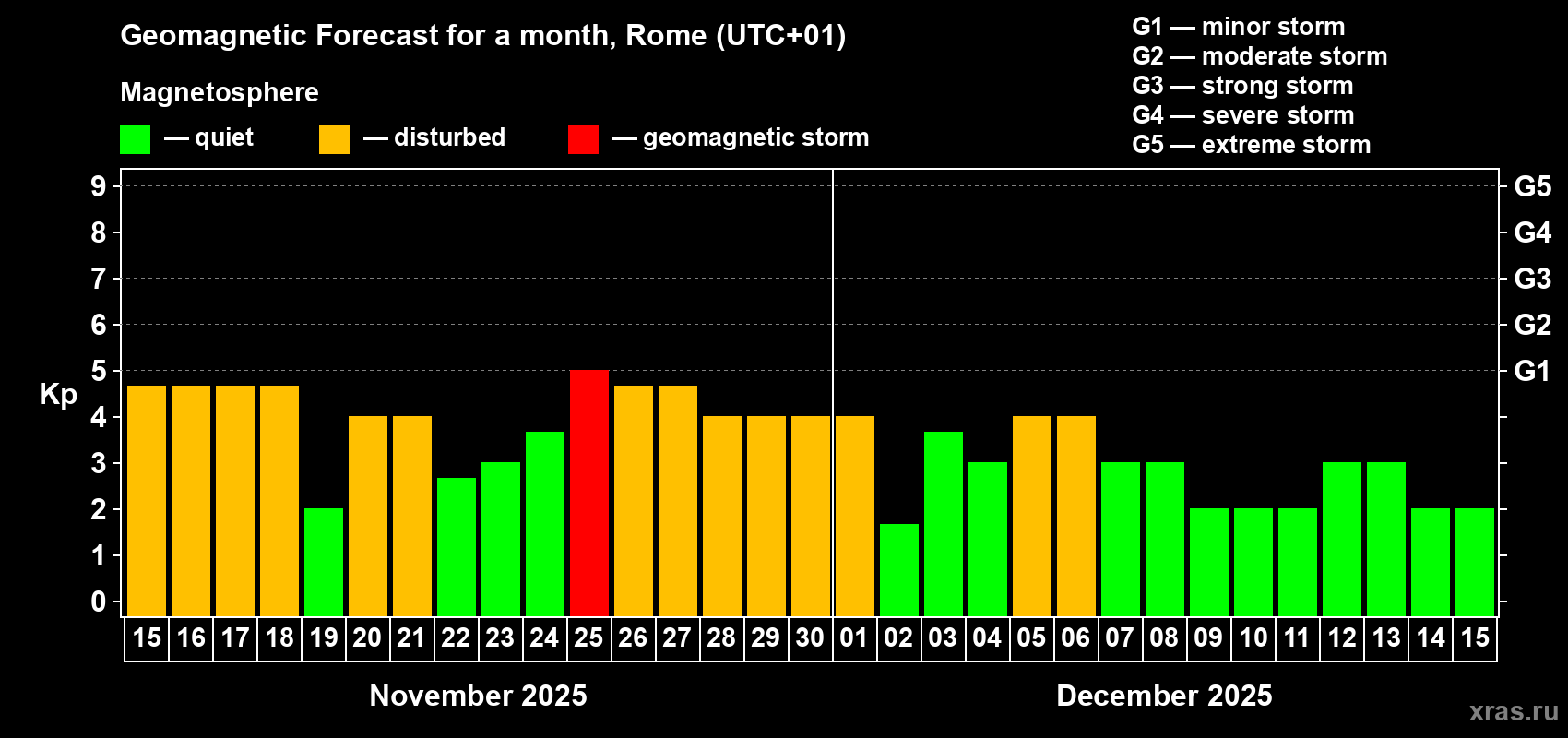 Geomagnetic storm forecast in Rome for Nov 15, 2025